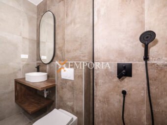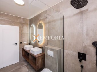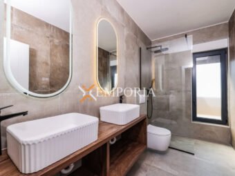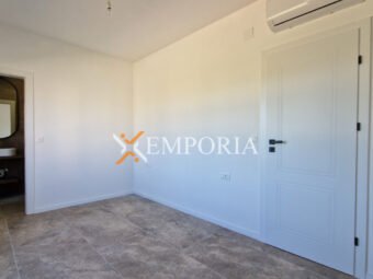 Construction of the building with brick thermoblock and thermal insulation of the facade 10 cm Styrofoam. The floor coverings are tiles. The windows are aluminum with three-layer glass, electric blinds and mosquito nets. There is an air conditioner in each bedroom and in the living room. In addition, electric underfloor heating in the bathroom. Furthermore, the entrance door of the apartment is burglar-proof and fire-proof.
