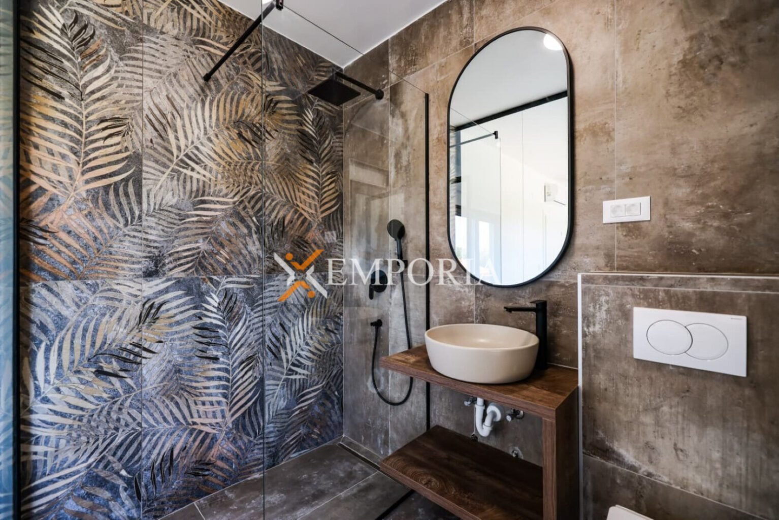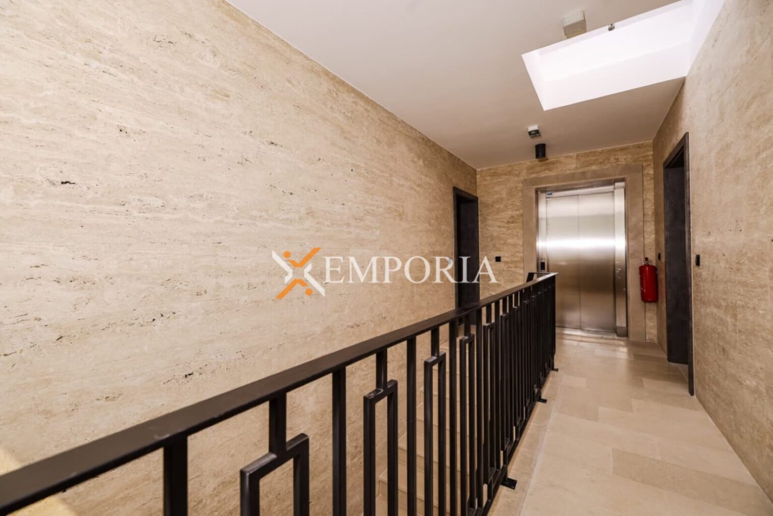 The layout of the rooms consists of a hallway, a bathroom, two bedrooms, a bedroom with its own bathroom, a kitchen, a dining room and a living room, and an uncovered terrace. From the uncovered terrace stairs lead to the roof terrace of 102,29 m2. The net usable area of the described premises is 121,22 m2. The apartment also has two parking spaces in front of the building.