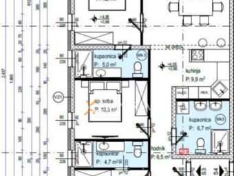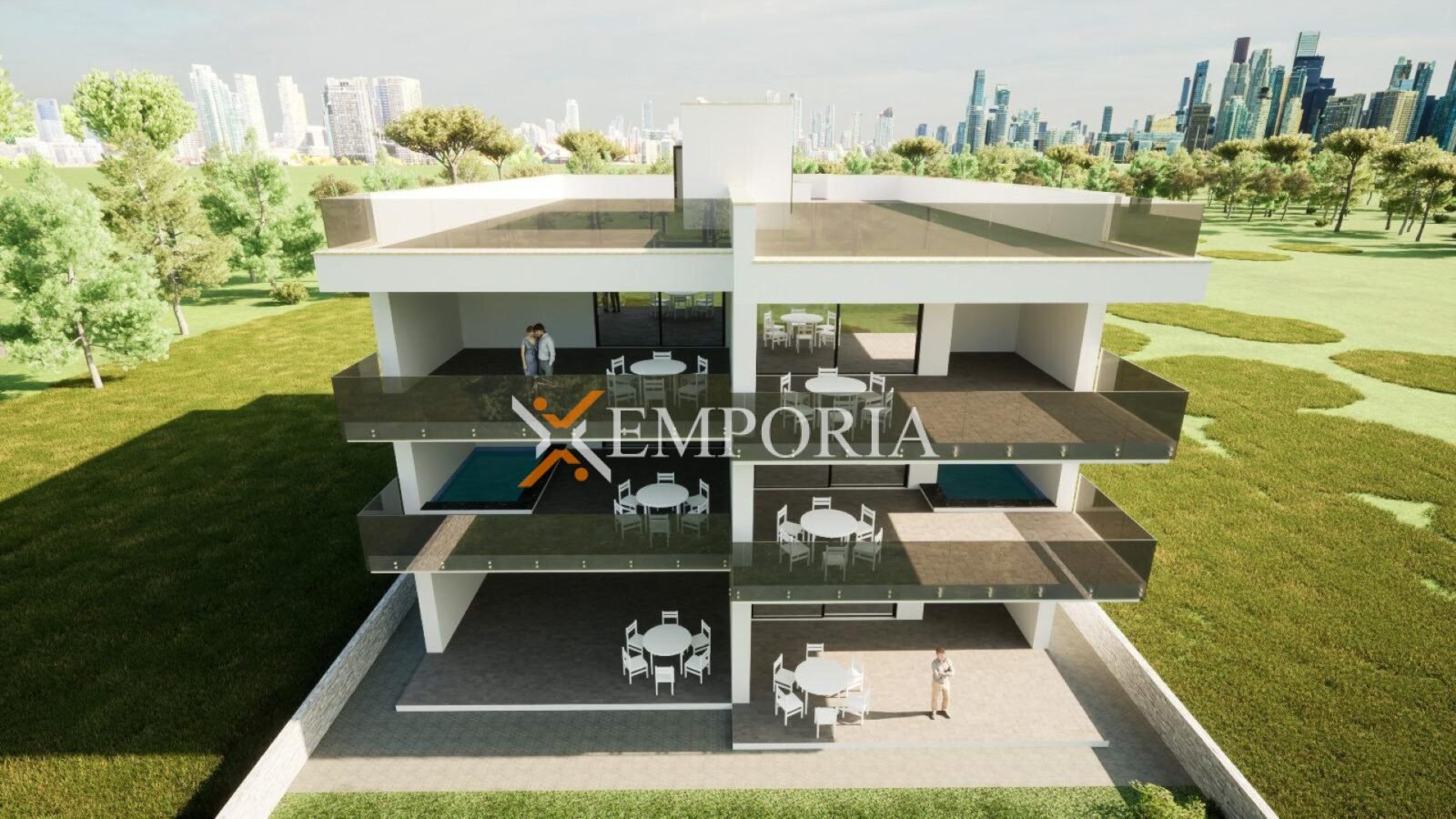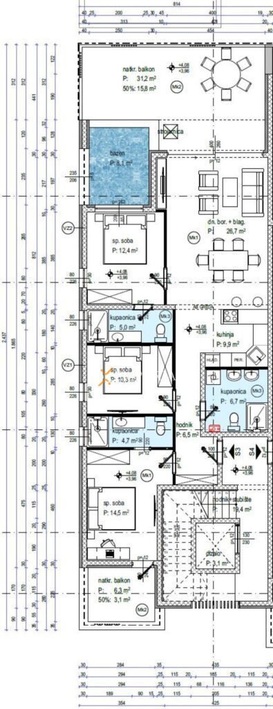 This is an apartment on the 1st floor. The layout of the rooms consists of a hallway, a bedroom, two bedrooms each with bathrooms, a bathroom, a kitchen with a dining room and a living room, a covered terrace, and a covered terrace with a pool of 15,10 m2. The total net area of the described premises is 124,27 m2.