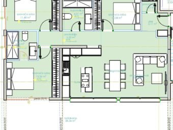 The bathrooms are equipped with electric underfloor heating, and four air-conditioning units are installed in the living room and bedrooms, ensuring comfortable temperatures throughout the year.