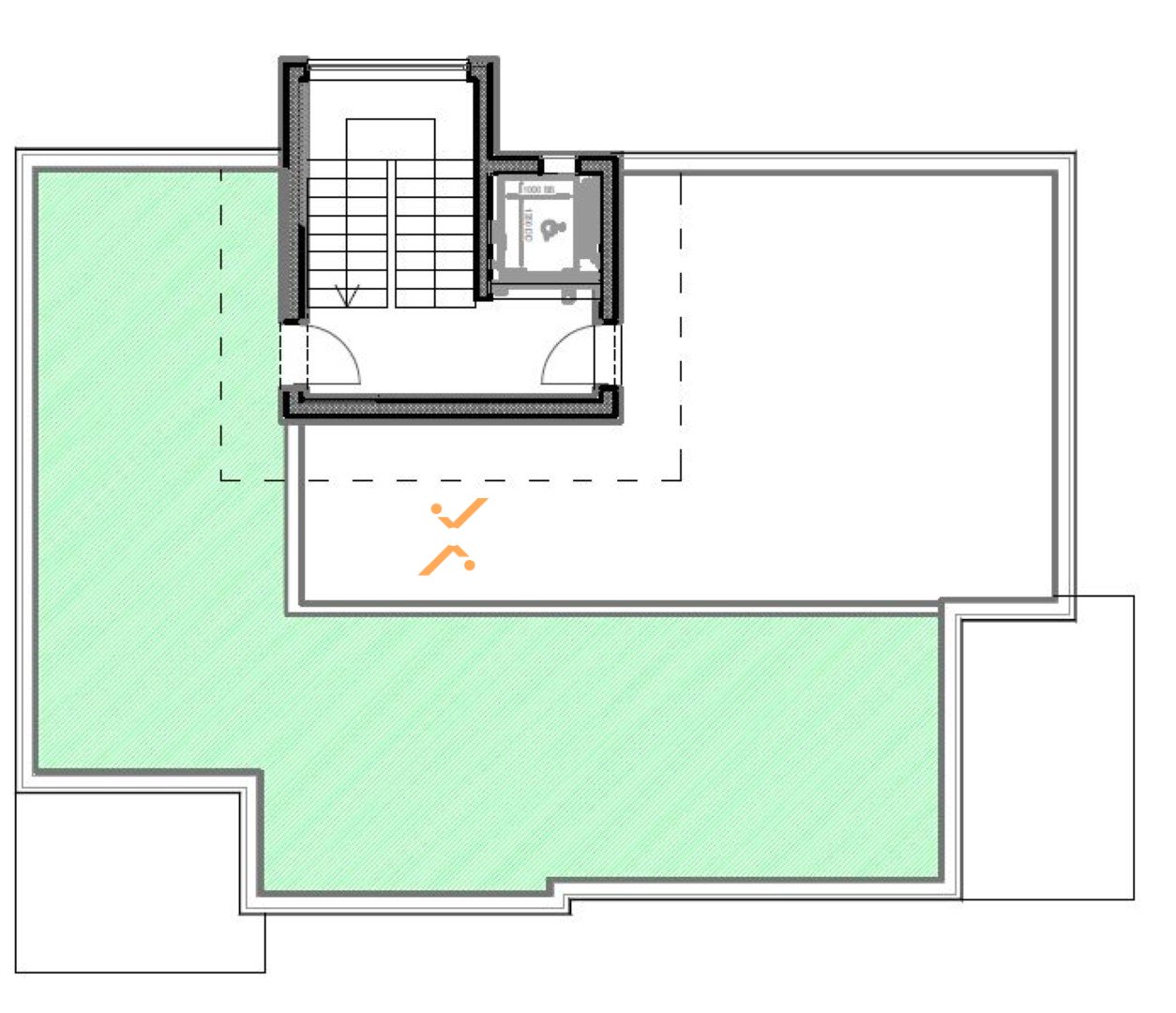 The apartment is located on the second floor of a modern building with a lift that connects the basement to the rooftop terraces. The layout includes an entrance hall, two bedrooms, a bathroom, and a kitchen with dining area and living room with access to a covered terrace. The net surface area of the interior living space with the covered terrace amounts to 53,08 m². From the staircase, there is access to a private rooftop terrace with a total surface of 61 m², of which 3,50 m² is covered, providing an exceptional outdoor living area. The net usable area of the described spaces amounts to 69,21 m².