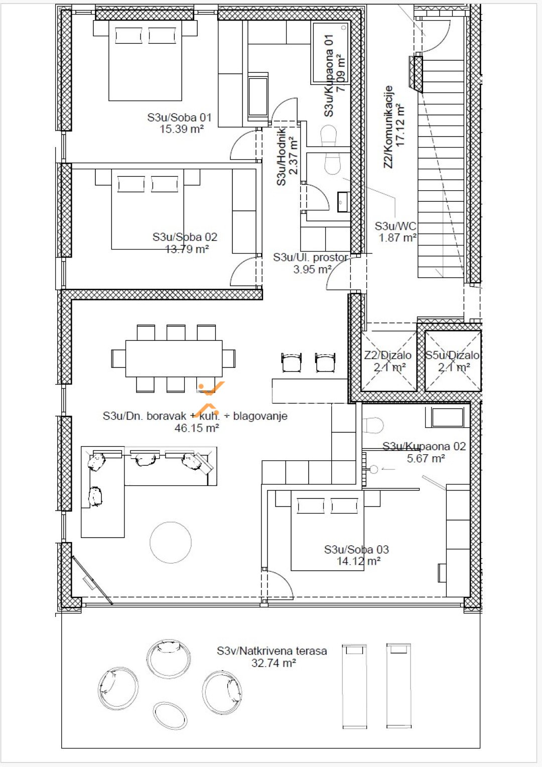 The apartment includes a storage room of 8,80 m2 and two garage parking spaces, which significantly increase comfort and functionality.
