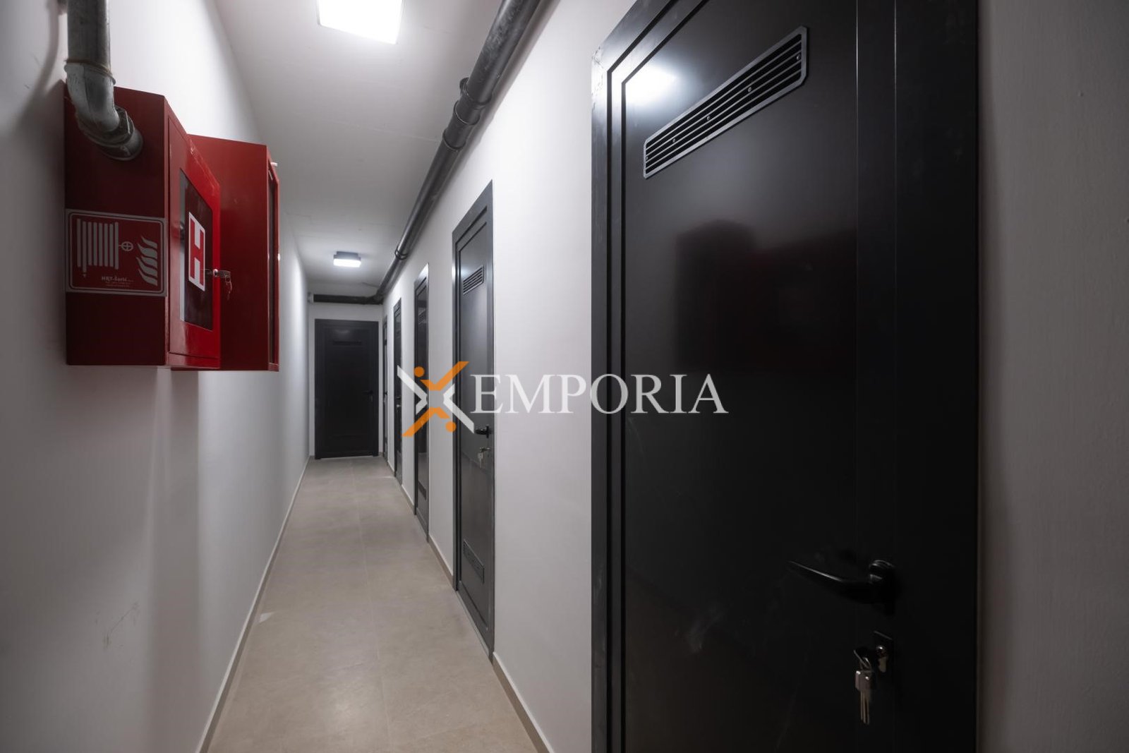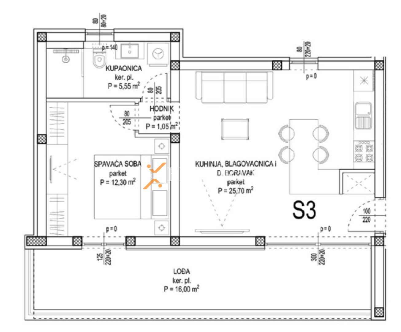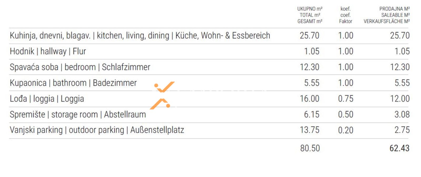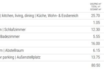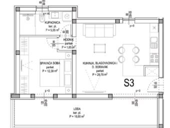 The layout comprises an entrance hall, one bedroom, a bathroom, an open-concept kitchen with dining area and living room, as well as a loggia. The net usable interior area amounts to 56,60 m2. The apartment also includes a storage room of 6,15 m2 in the basement and one outdoor parking space. The total net usable area with all appurtenances is 62,43 m2.