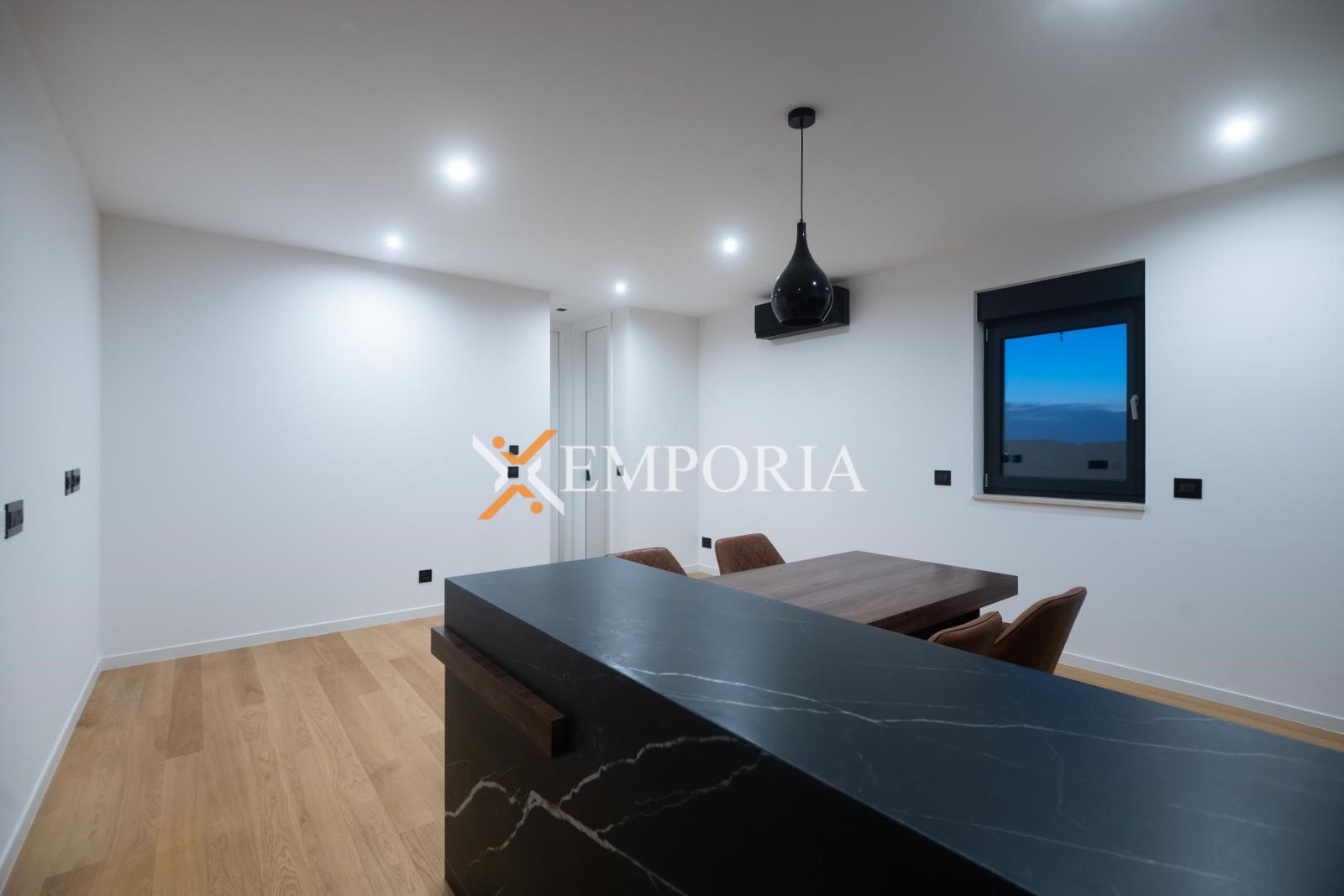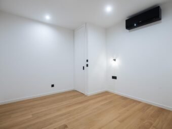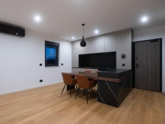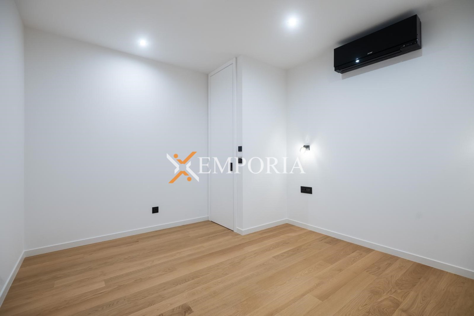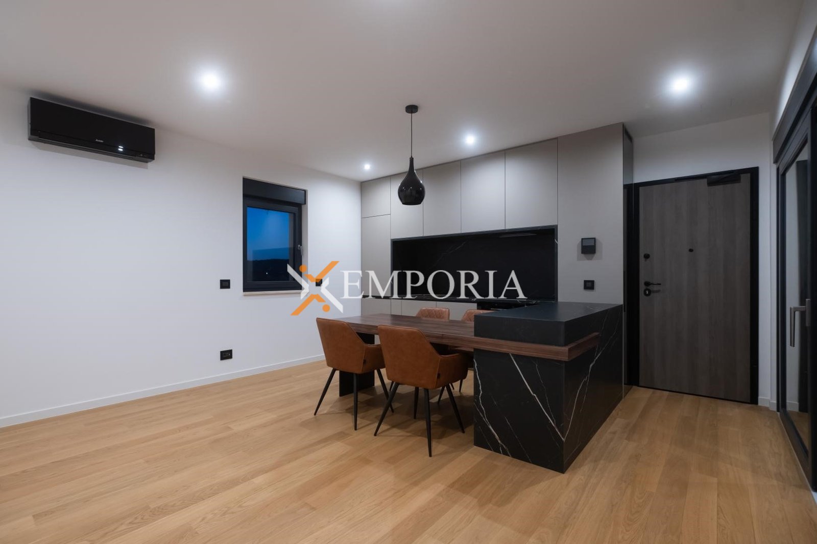 The apartment features electric underfloor heating throughout, while two black designer Mitsubishi air conditioning units provide a pleasant indoor climate all year round. The kitchen with Bosch appliances is included in the price, as well as a dining table with four chairs connected to the kitchen area.