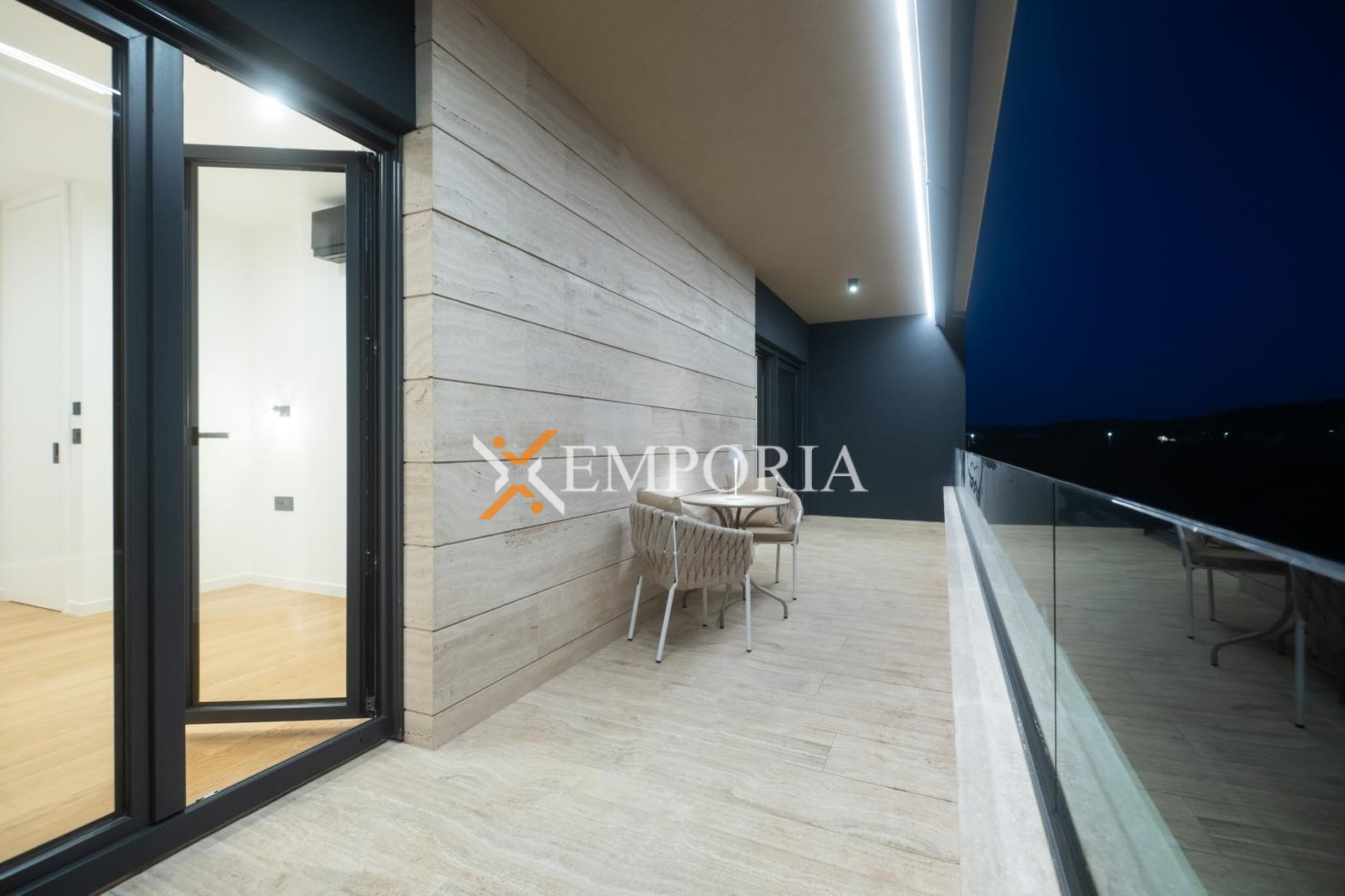 Floors are finished with parquet in all rooms, except the bathroom where ceramic tiles are installed. The loggia is equipped with a retractable cassette awning. Additional features include Hansgrohe taps and a washing machine.