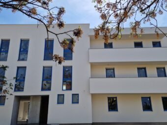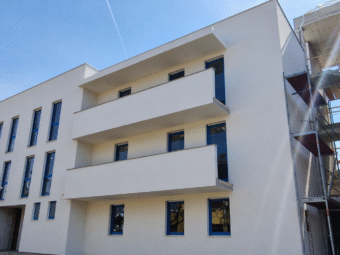 Aluminum windows with shutters and triple glazing are installed. The building is constructed with concrete walls, and the facade is insulated with 10 cm of styrofoam.