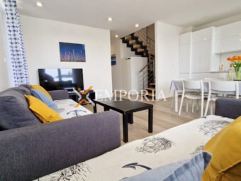 1st floor: hallway, bathroom, bedroom, kitchen with dining room and living room, balcony and stairs to 2nd floor.