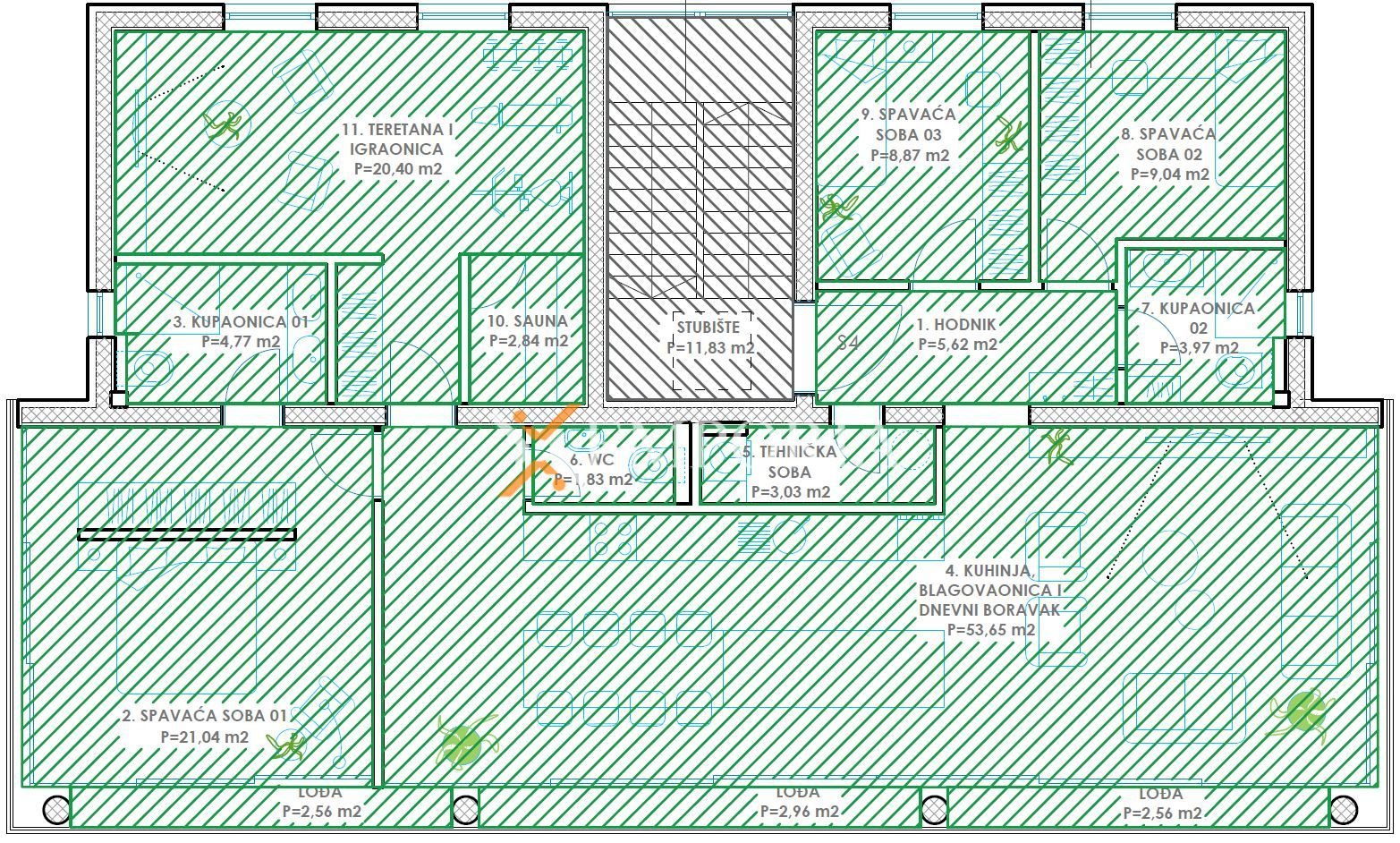 This is a second-floor apartment. The room layout consists of a hallway, a bedroom with bathroom, two other bedrooms, a bathroom, a laundry room, toilet, a kitchen with dining and living room, fitness and game-room, sauna and a loggia. The area of the described is 141,12 m2. The apartment also includes a garage parking space, an outdoor parking space and a storage room in the basement.