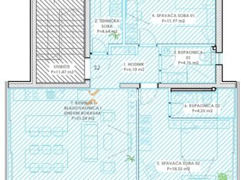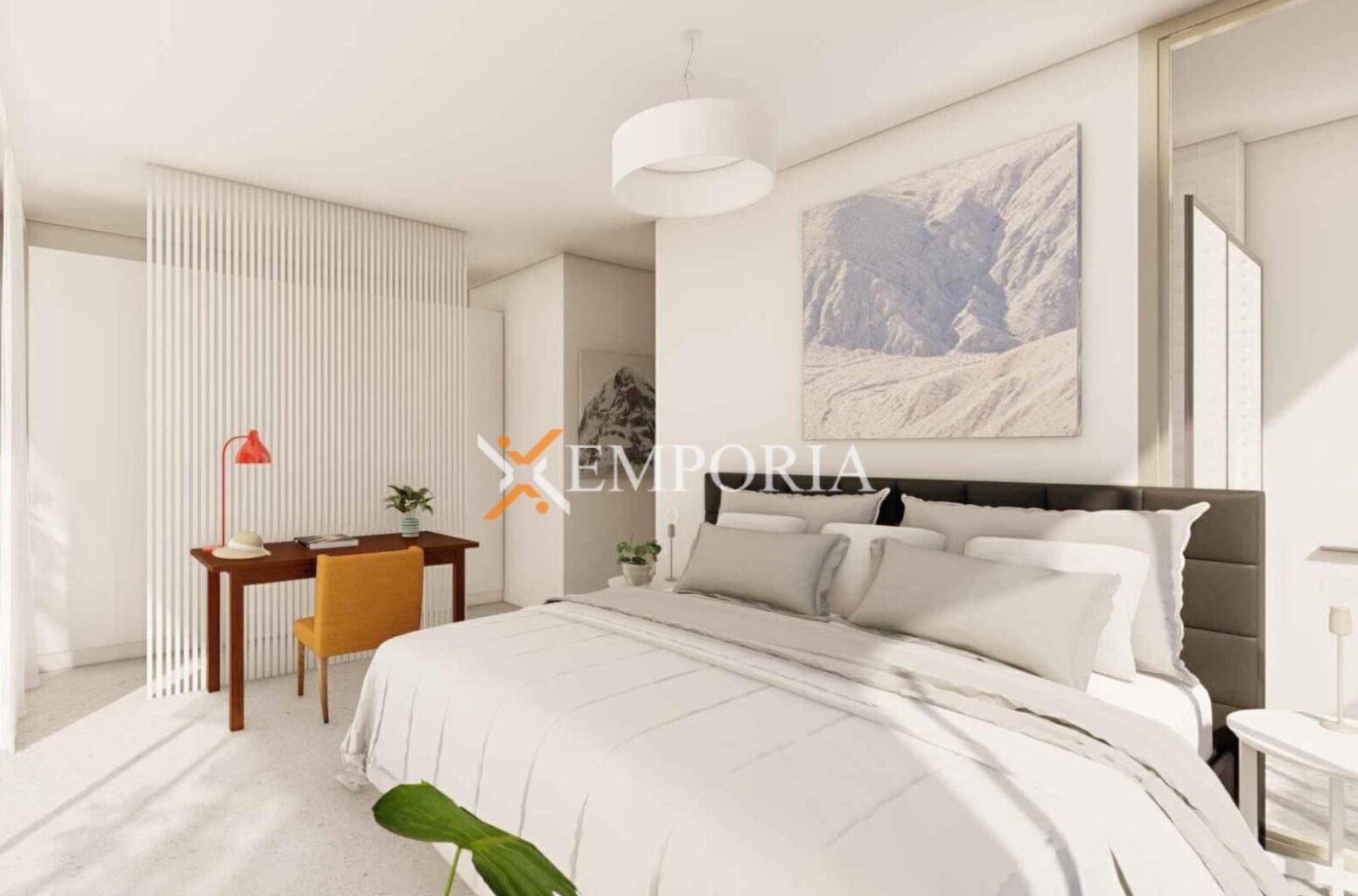 This is the only first floor apartment. The room layout consists of a hallway, a bedroom with a bathroom, a further bedroom, a bathroom, a laundry room, a kitchen with a dining and living room and a loggia. The surface of the described is 85,26 m2. The apartment also includes two outdoor parking spaces and a storage room in the basement.