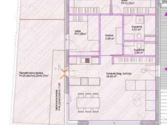 This is an apartment on the ground floor of the building. The layout of the rooms consists of a hallway, two bathrooms, three bedrooms, a kitchen with a dining room and a living room, a loggia, a covered terrace and a partially covered terrace. Net usable area of the described premises is 111,97 m2.