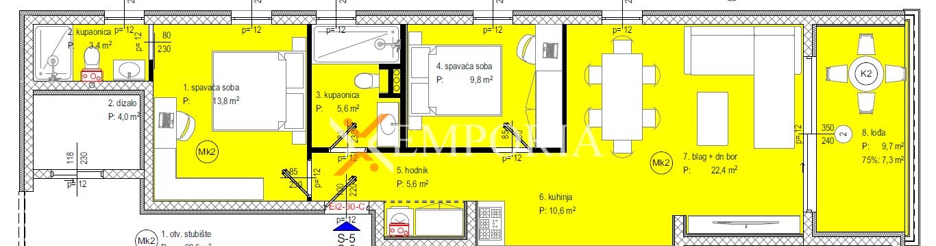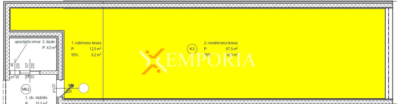 The apartment is situated on the second floor and has a net living area of 101,52 m². The layout includes a hallway, kitchen with dining area and living room, one bedroom, another bedroom with an en-suite bathroom, an additional bathroom, a loggia, and a rooftop terrace of 79,95 m² that offers privacy and a perfect space for gatherings.