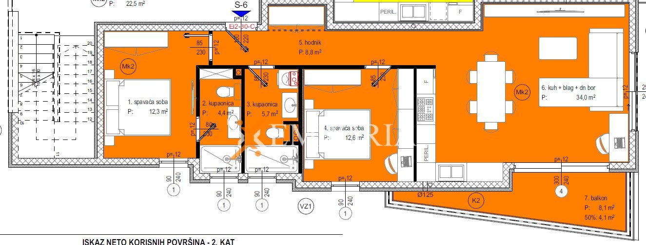 The apartment comes with two parking spaces, and the total net usable area with additions amounts to 113,79 m².