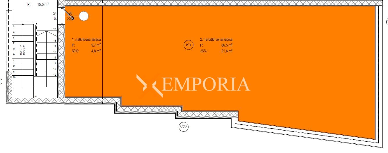 For sale is a modern penthouse in a new building, located in a peaceful part of Zadar, Crvene kuće, only 1,3 km from the sea and 2,8 km from the city center. This attractive property offers a perfect combination of modern design, functionality, and high-quality construction, featuring a large rooftop terrace of 96,21 m², ideal for relaxation and social gatherings.