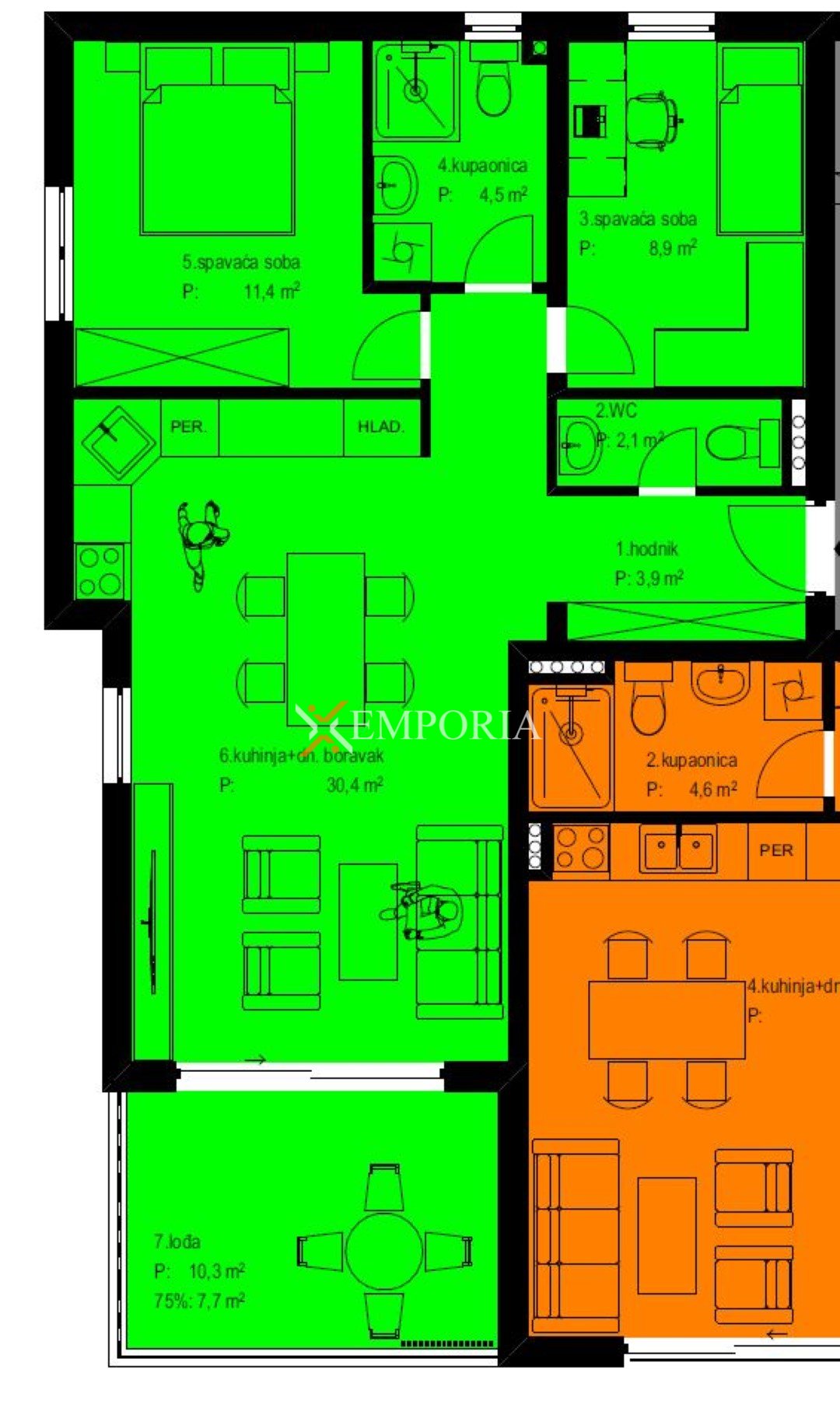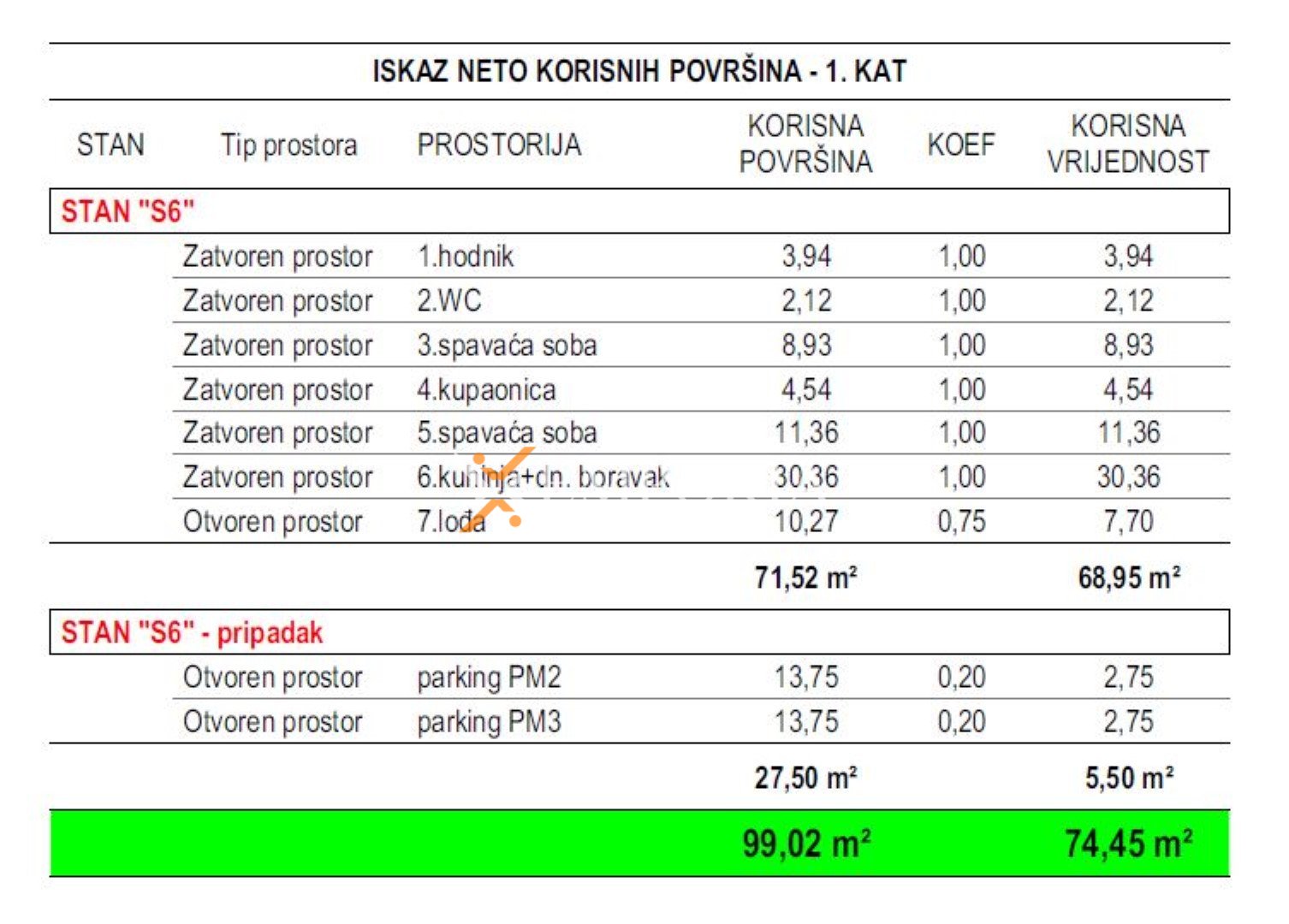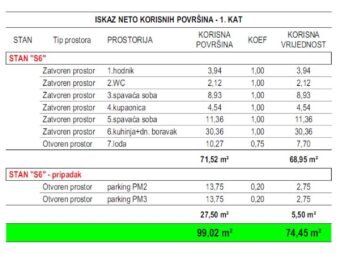 The apartment features a functional and well-organised layout. It consists of an entrance hall, two bedrooms, a bathroom, a separate WC, a kitchen with dining area and living room, as well as a loggia. The net usable area of the interior spaces amounts to 68,95 m². In addition, the apartment includes two parking spaces, which further enhances everyday comfort. The total net area with all associated parts is 74,45 m².