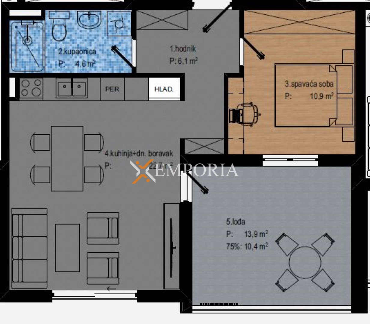 The layout consists of an entrance hall, one bedroom, a bathroom, a kitchen with dining area and living room in an open space concept, and a loggia. The net usable area of the described rooms is 54,74 m2. The total net area with accessories is 60,24 m2.