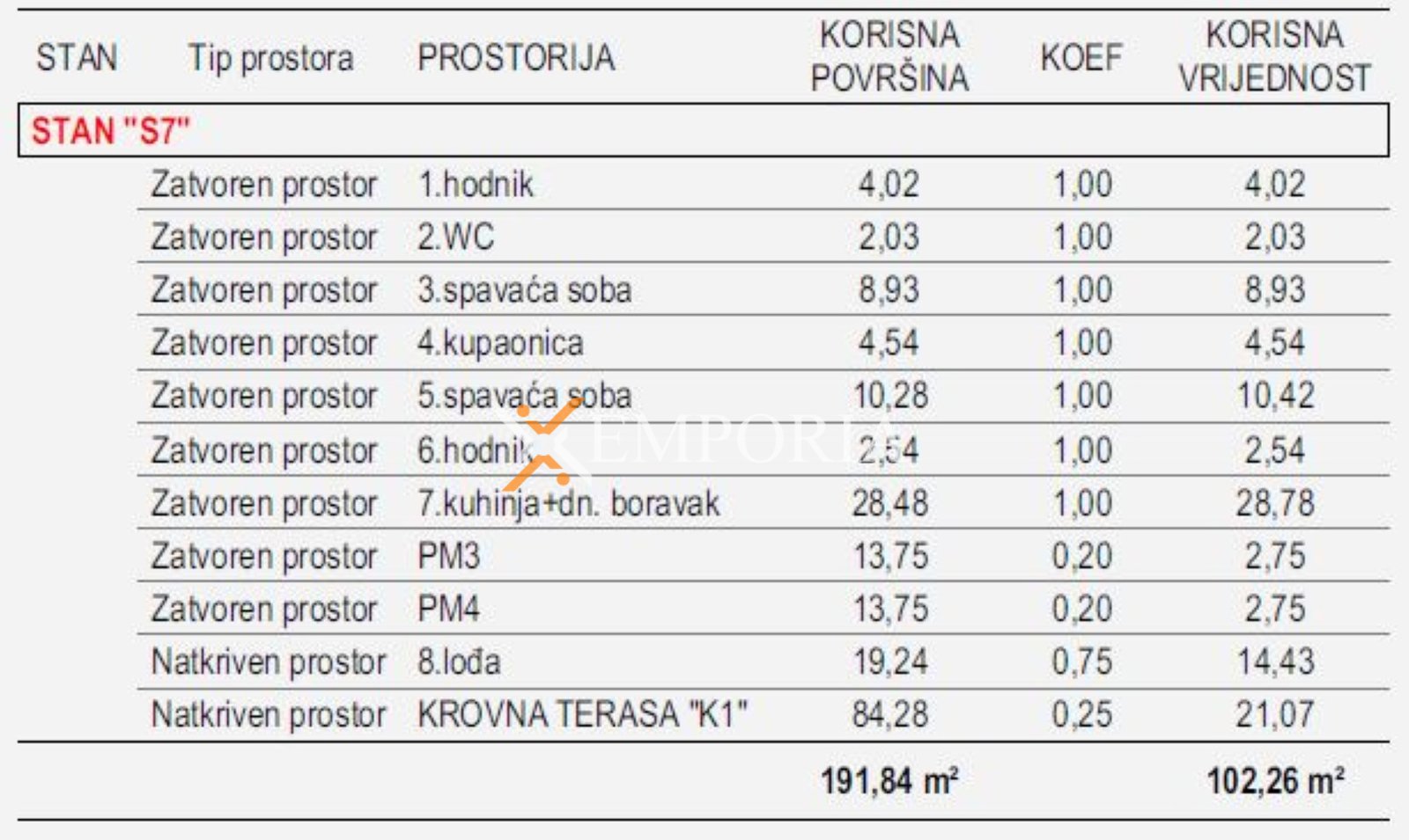 The net usable area of the described rooms is 96,76 m2, while the total net area with accessories is 102,26 m2. The apartment includes two parking spaces, which represent a significant advantage in this city location.