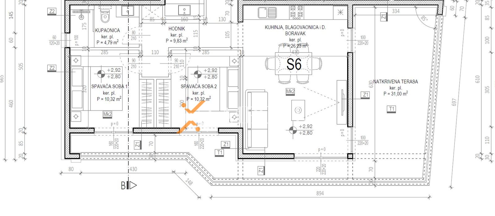 The apartment consists of an entrance hall, 2 bedrooms, laundry/WC, bathroom, kitchen with dining area and living room, and a covered terrace. The net usable area is 80,57 m2. In addition, the property includes 2 parking spaces and a storage room in the basement, which increases comfort and practicality.