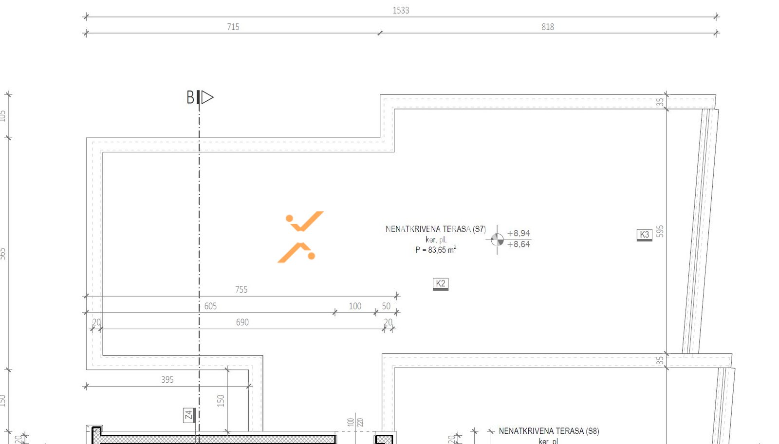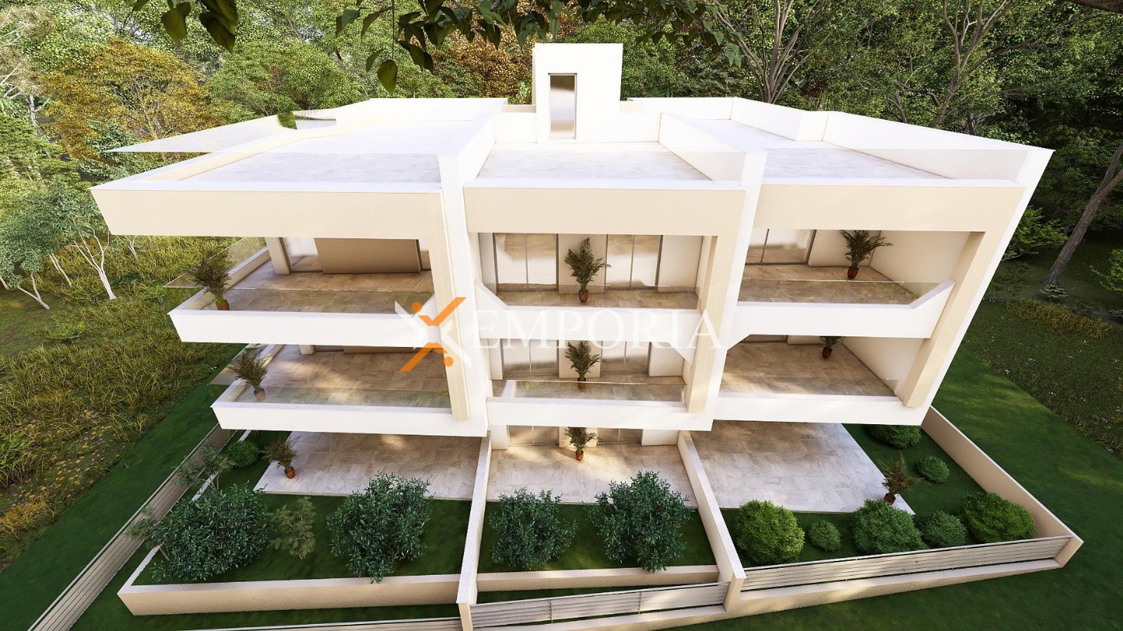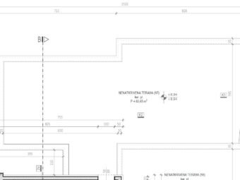 The apartment consists of an entrance hall, 2 bedrooms, laundry/WC, bathroom, kitchen with dining area and living room, and a loggia (77,13 m2 net), while from the stairs it leads to a rooftop terrace of 83,65 m2. The net usable area of enclosed rooms is 98,04 m2. Additionally, the apartment includes 2 parking spaces and a storage room in the basement.