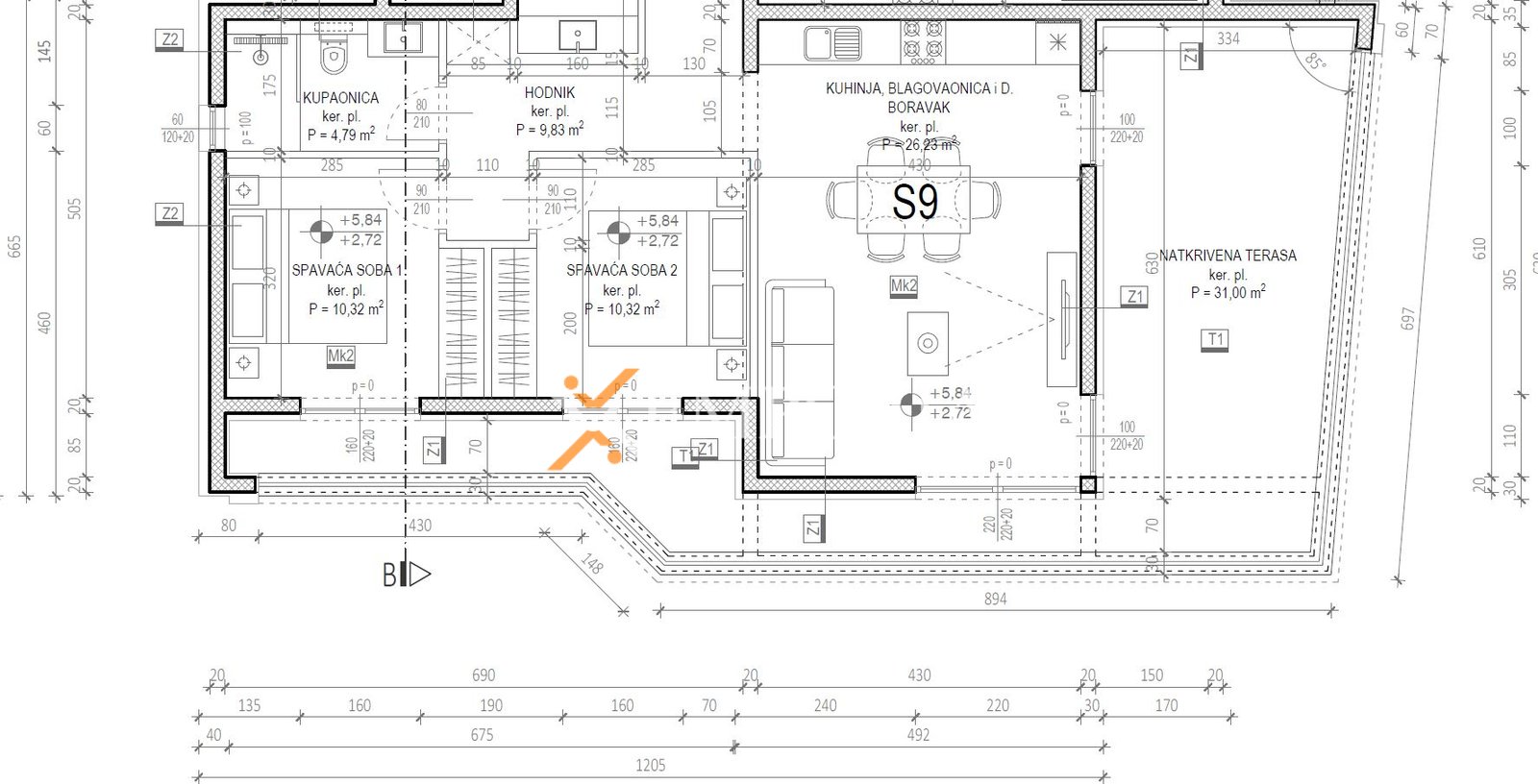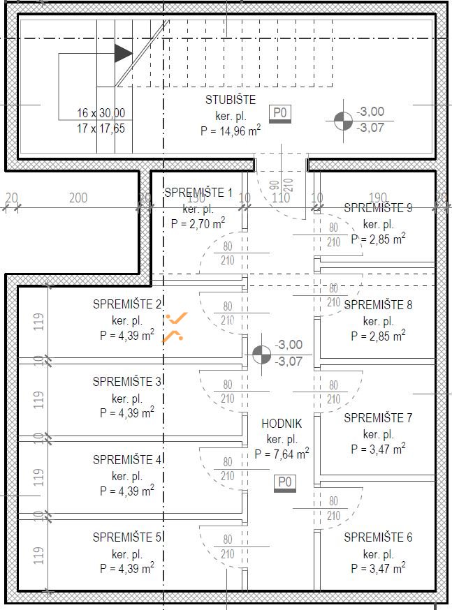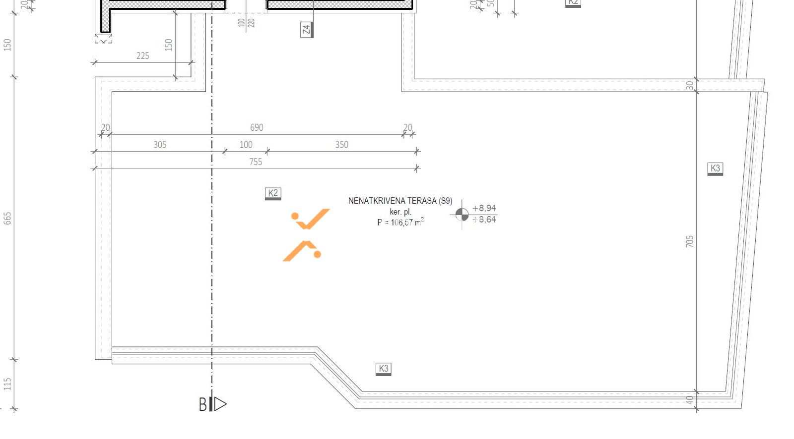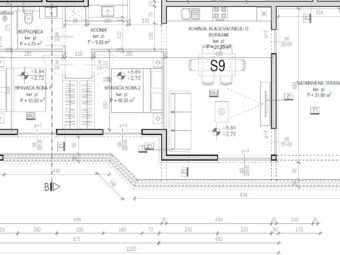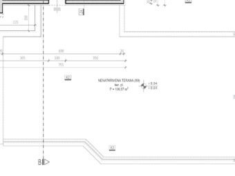 The apartment consists of an entrance hall, 2 bedrooms, laundry/WC, bathroom, kitchen with dining area and living room, and a loggia (80,57 m2 net), while from the stairs it leads to a rooftop terrace of 106,57 m2. The net usable area of enclosed rooms is 107,21 m2. Additionally, the apartment includes 2 parking spaces and a storage room in the basement.