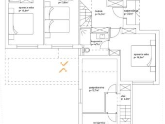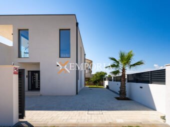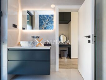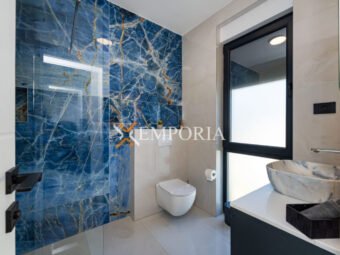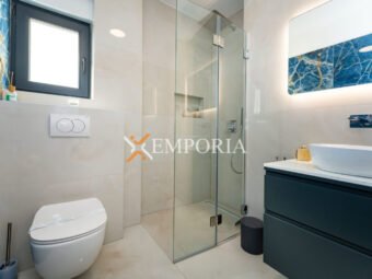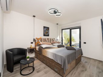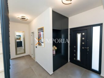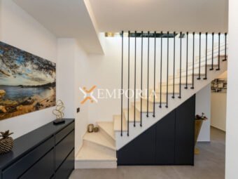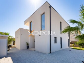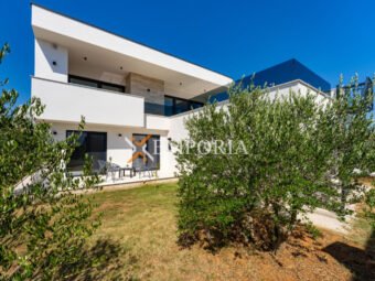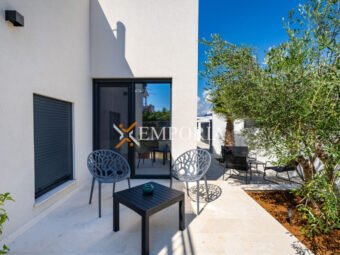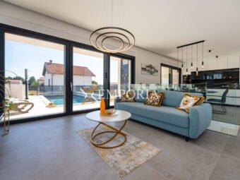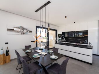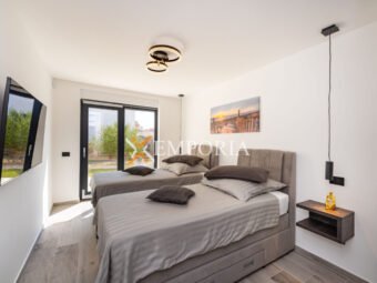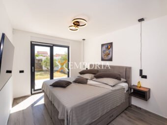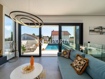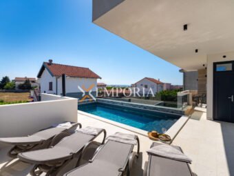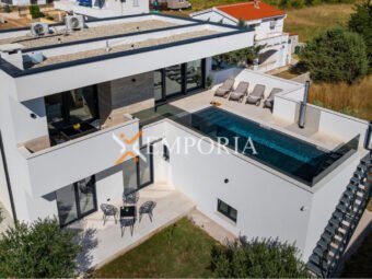 A beautiful newly built villa with a swimming pool in Vrsi is for sale. It consists of ground floor and first floor. The pool is upstairs, with partial sea views.