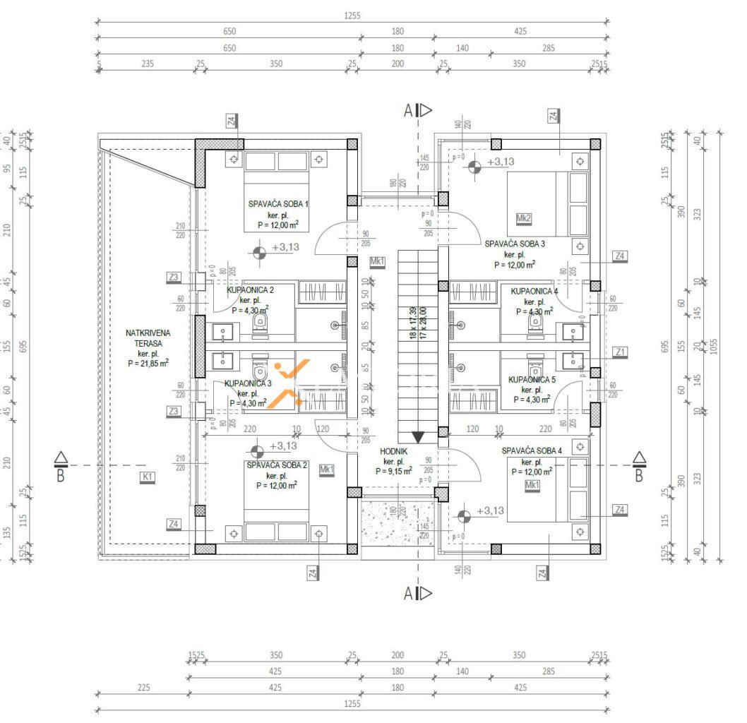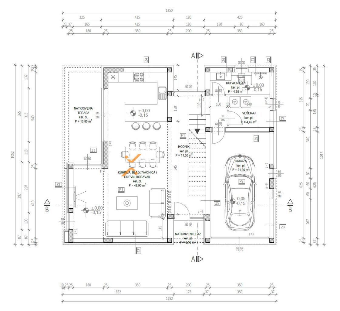 The house consists of a ground floor and a first floor. Layout of the rooms on the ground floor consists of a hallway, a laundry room, a bathroom, a kitchen with a dining room and a living room, a covered terrace, and a garage. Internal stairs lead to the first floor where there is a hallway, 4 bedrooms each with a bathroom and a partially covered terrace.