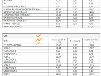 The house consists of a ground floor and a first floor. This is the north side of the semi-detached house. The ground floor consists of an entrance, a gym, an area with a sauna, a toilet, a laundry room, a kitchen with a dining room and a living room, two covered terraces and a summer kitchen with barbecue. Internal stairs lead to the first floor where there is a hallway, four bedrooms each with their own bathroom, dressing room and loggia. The area of the described premises is 266 m2.