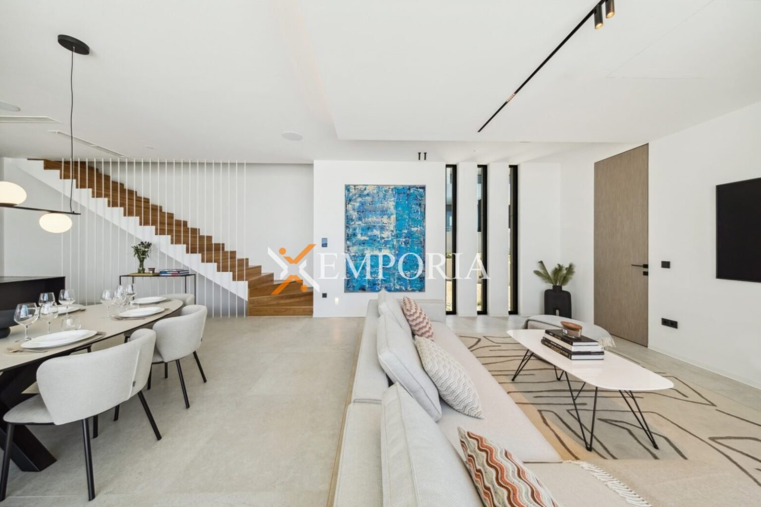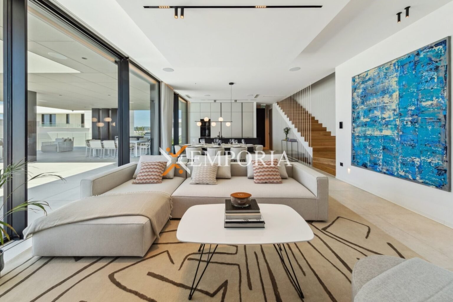 The villa is fully furnished with premium furniture and high-end appliances. All rooms are equipped with ceiling air conditioning, and bathrooms feature underfloor heating powered by a heat pump. The pool includes hydro-massage jets, heating and cooling functions, and an outdoor shower. For a complete audio experience, the house features 19 built-in speakers.