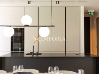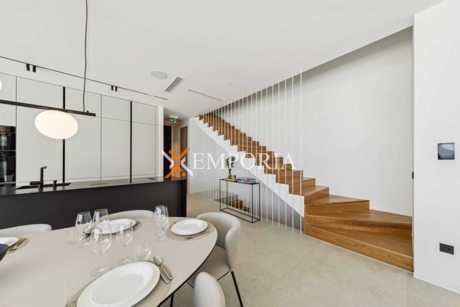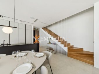 The ground floor (217,80 m2 gross) features an entrance hall, two guest toilets, a spacious kitchen with dining and living area, one bedroom with en-suite bathroom and built-in wardrobe, an additional laundry room and a partly covered terrace perfect for outdoor enjoyment.