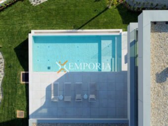 The landscaped garden has an automatic irrigation system. Solar panels are installed on the roof. The villa includes two uncovered outdoor parking spaces, a private asphalt access road, and security doors with fire and burglary resistance. The construction features concrete walls, aluminum joinery and excellent thermal insulation.