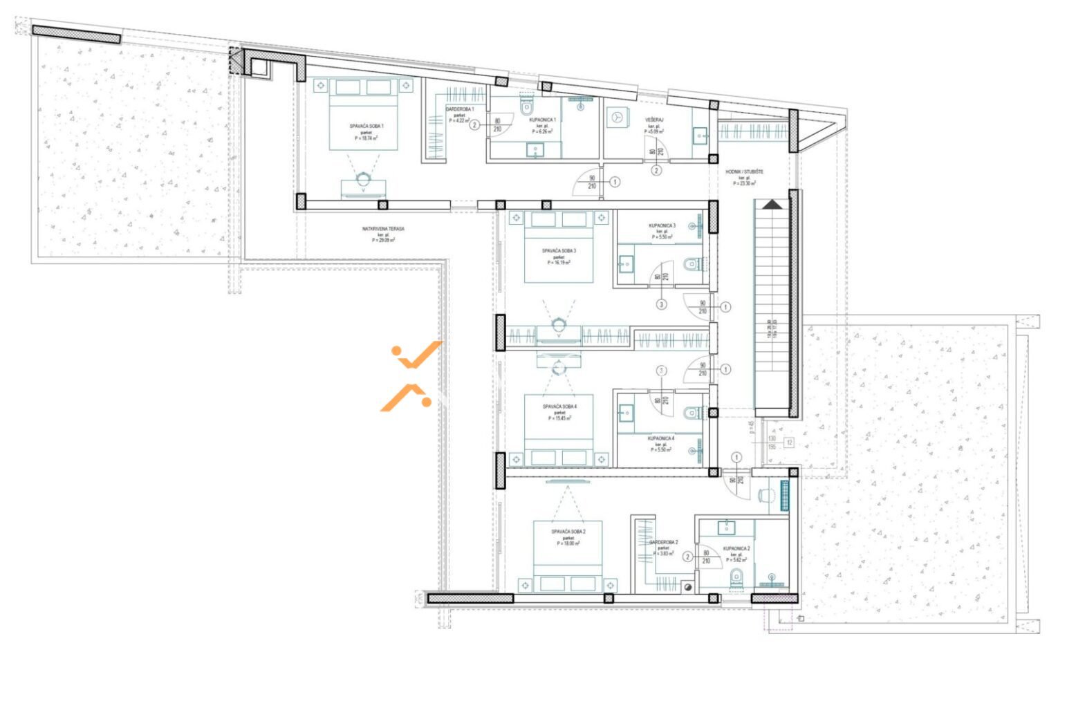 The first floor consists of four comfortable bedrooms, each with its own bathroom. Two of the bedrooms include walk-in wardrobes. The floor also includes a laundry room, a central hallway with stairs, and a generous covered terrace. The total surface area of the first floor is 156.79 m².