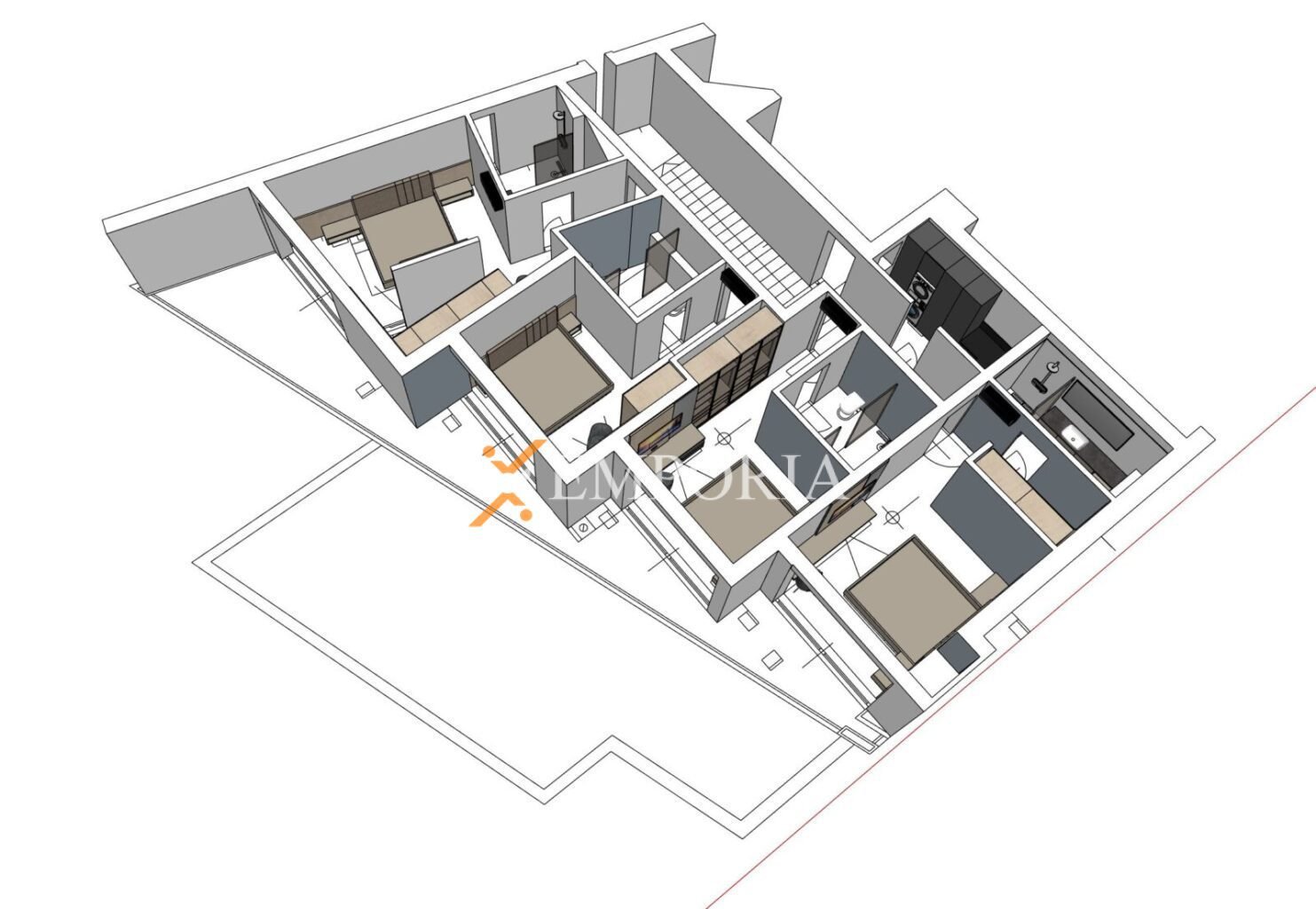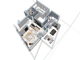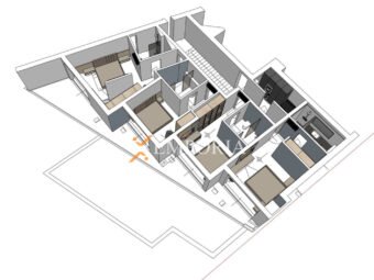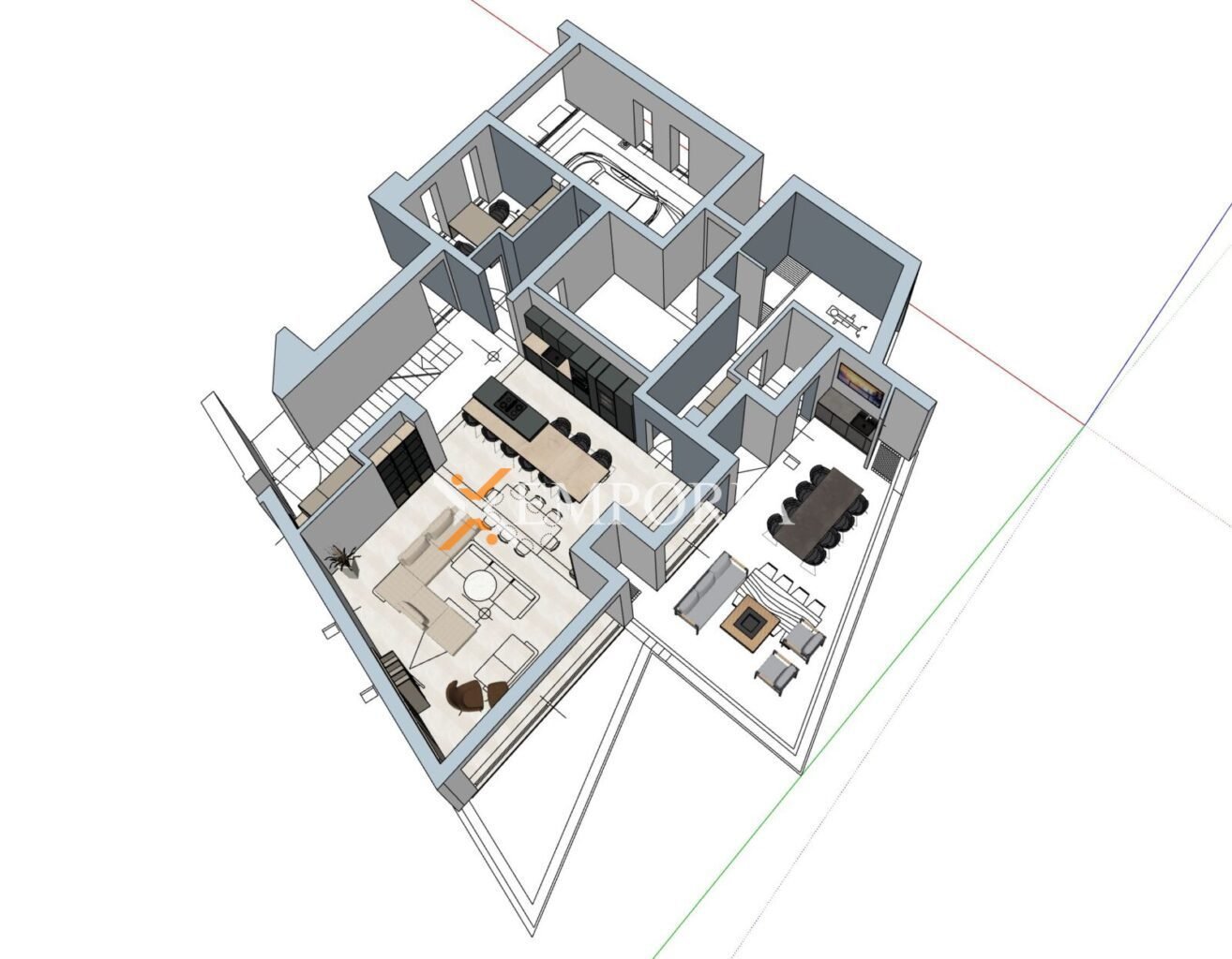 The ground floor features a welcoming covered entrance, a spacious entrance hall with an internal staircase, a home office, a garage, a technical room, and an open-concept kitchen, dining, and living area. This level also includes a hallway, a guest WC, a fully equipped gym, and a large covered terrace perfect for outdoor dining and relaxation. The total surface area of the ground floor is 205.55 m².