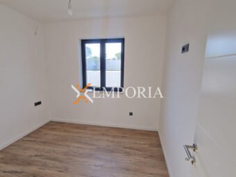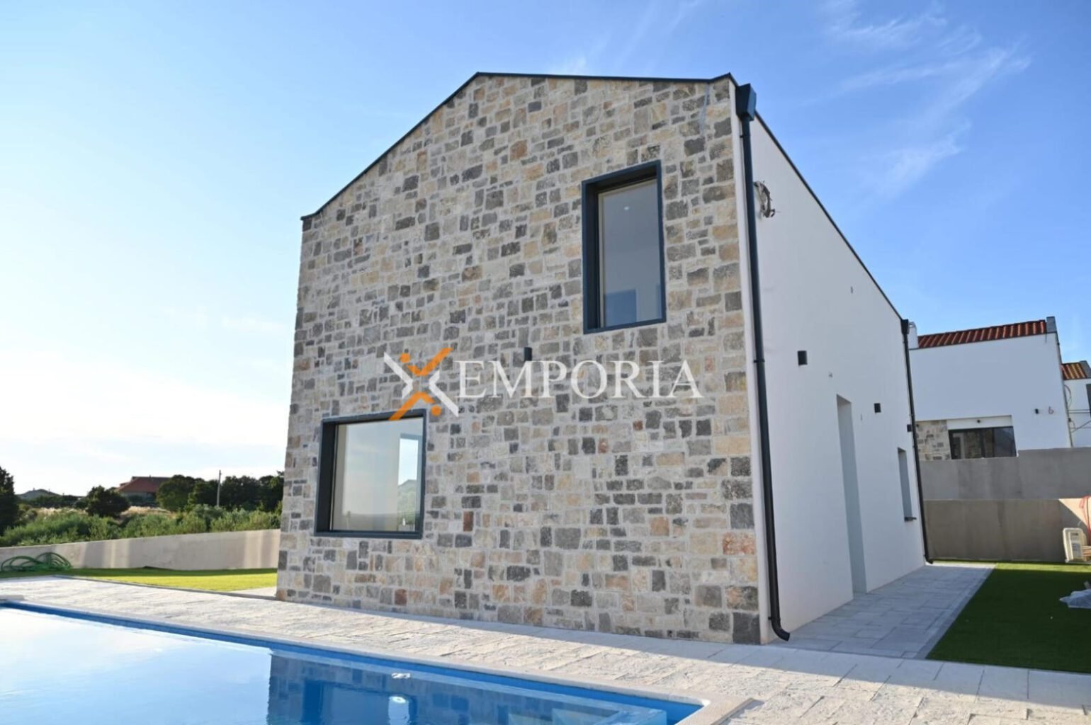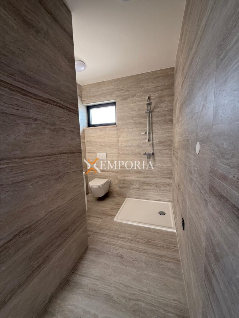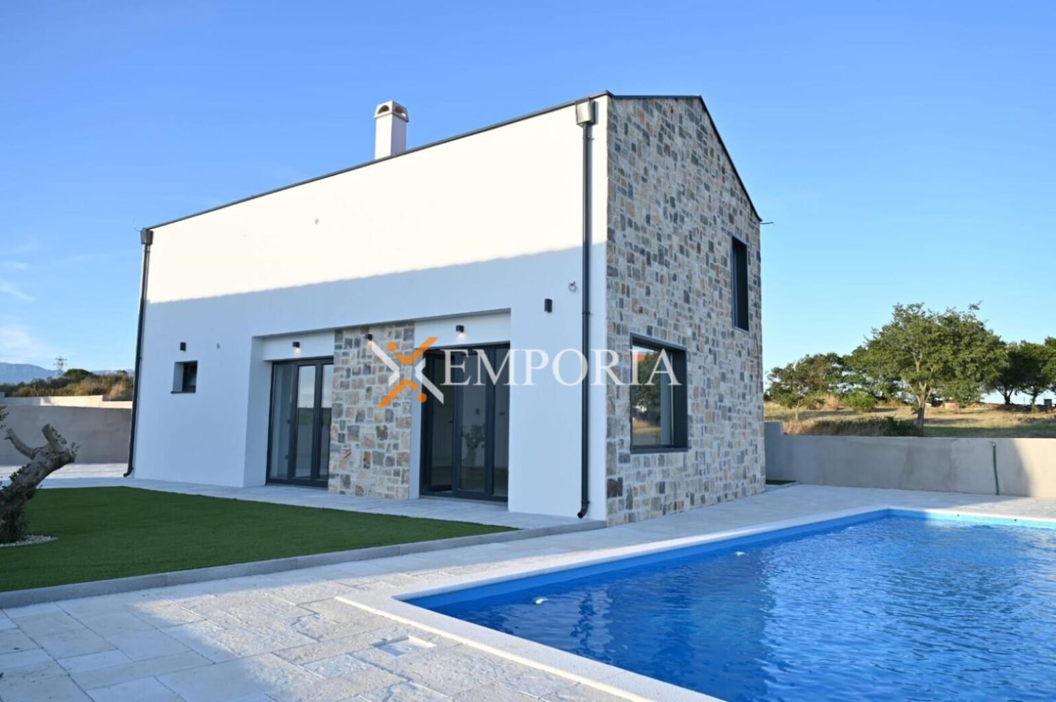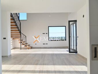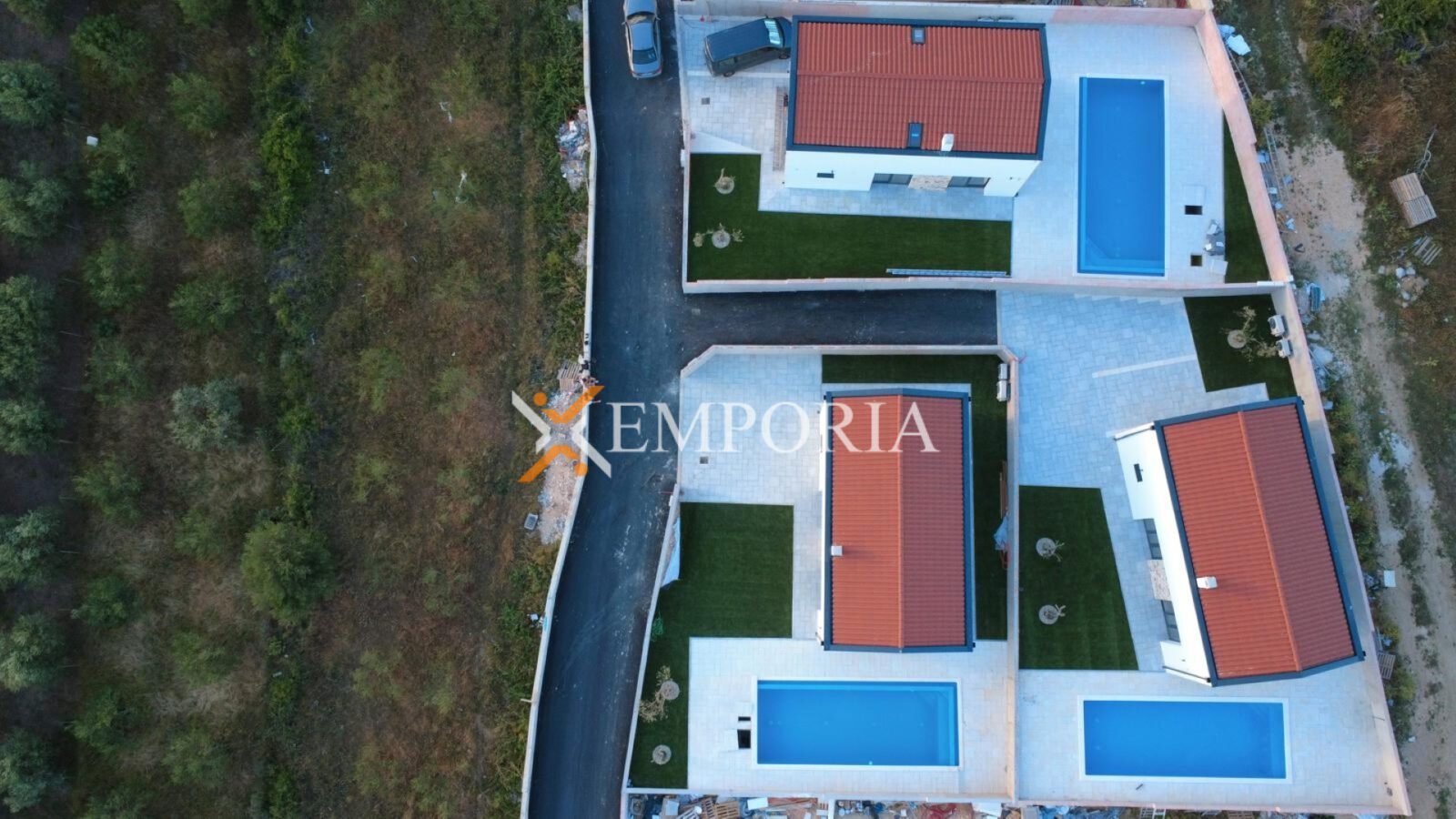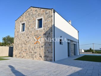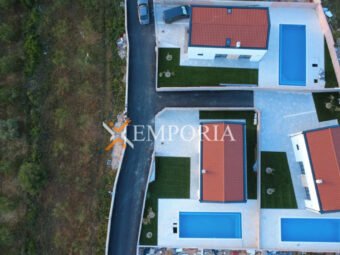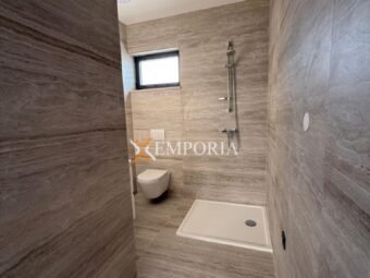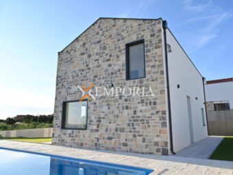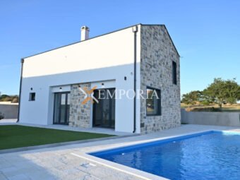 In the peaceful village of Visočane, Municipality of Poličnik, a modern newly built house with a pool is for sale, located just 6 km from the sea and 300 m from the village center. The house is spread over two floors with a carefully designed layout for comfortable living. The ground floor features an entrance hall, a bedroom with its own bathroom, a kitchen with dining and living area, an additional WC, and a laundry room. An internal staircase leads to the first floor, where there is a hallway and two bedrooms, each with its own bathroom. The net usable living area is 102,53 m², while the land size is 449 m². The exterior offers a beautifully landscaped garden, a 40 m² pool with foil lining and preparation for heating, and two parking spaces.