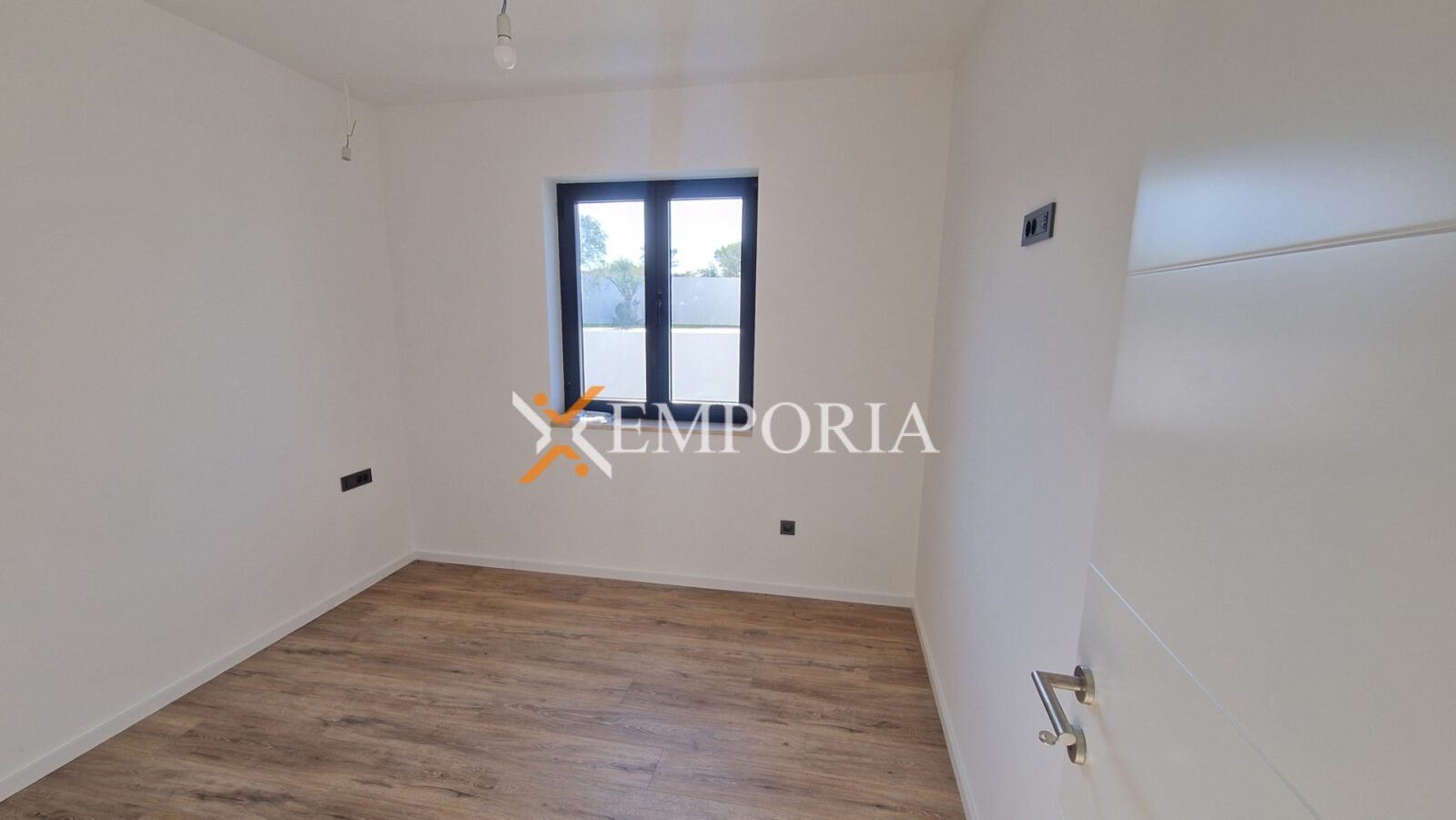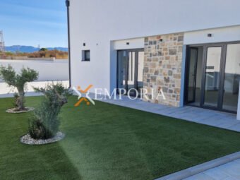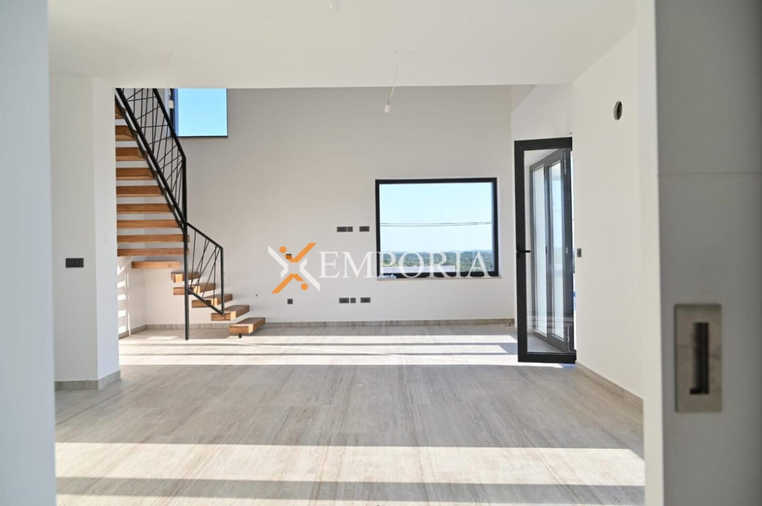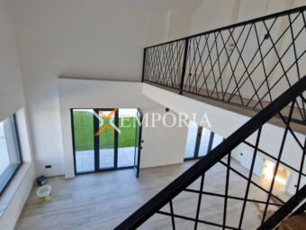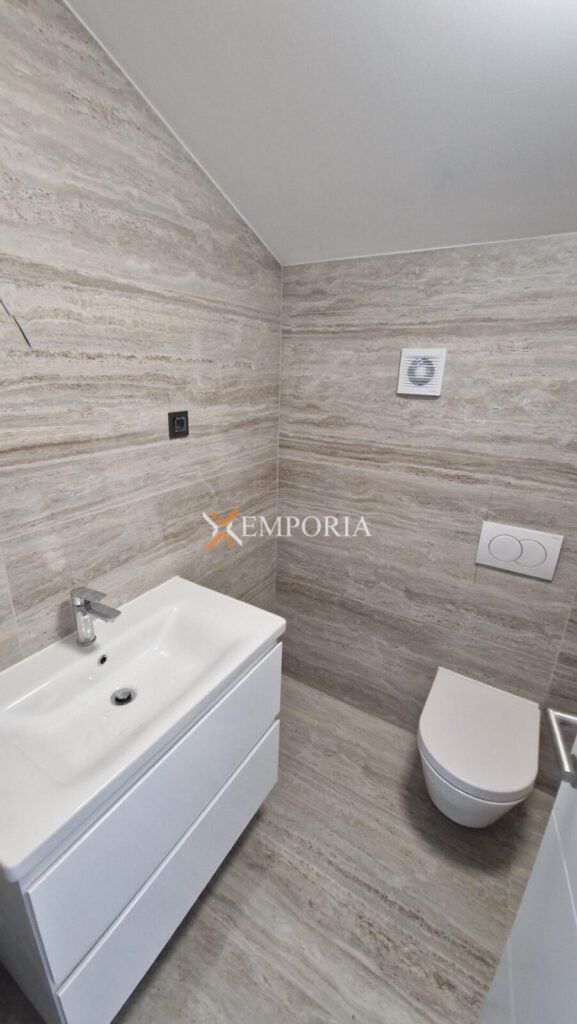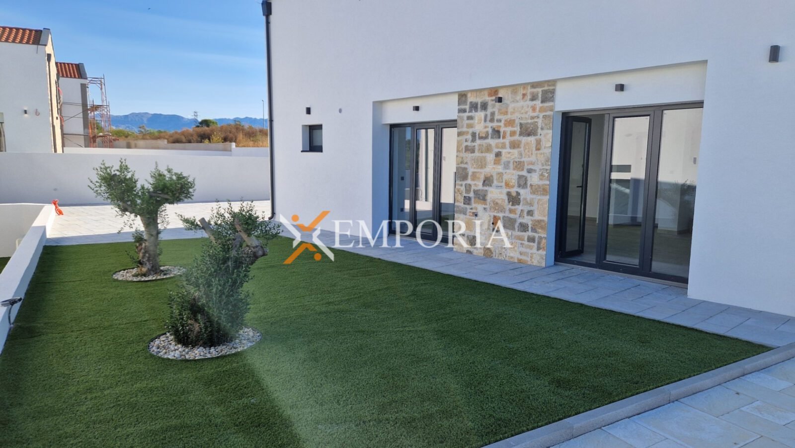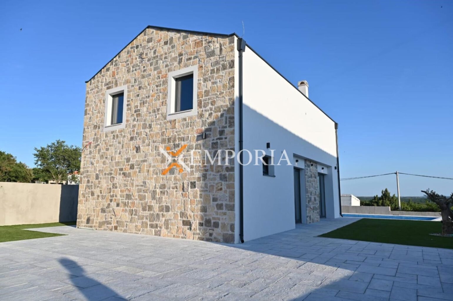 In the peaceful village of Visočane, Municipality of Poličnik, a modern newly built house with a pool is for sale, located just 6 km from the sea and 300 m from the village center. The house is spread over two floors with a carefully designed layout for comfortable living. The ground floor features an entrance hall, a bedroom with its own bathroom, a kitchen with dining and living area, an additional WC, and a laundry room. An internal staircase leads to the first floor, where there is a hallway and two bedrooms, each with its own bathroom. The net usable living area is 102,53 m², while the land size is 449 m². The exterior offers a beautifully landscaped garden, a 40 m² pool with foil lining and preparation for heating, and two parking spaces.