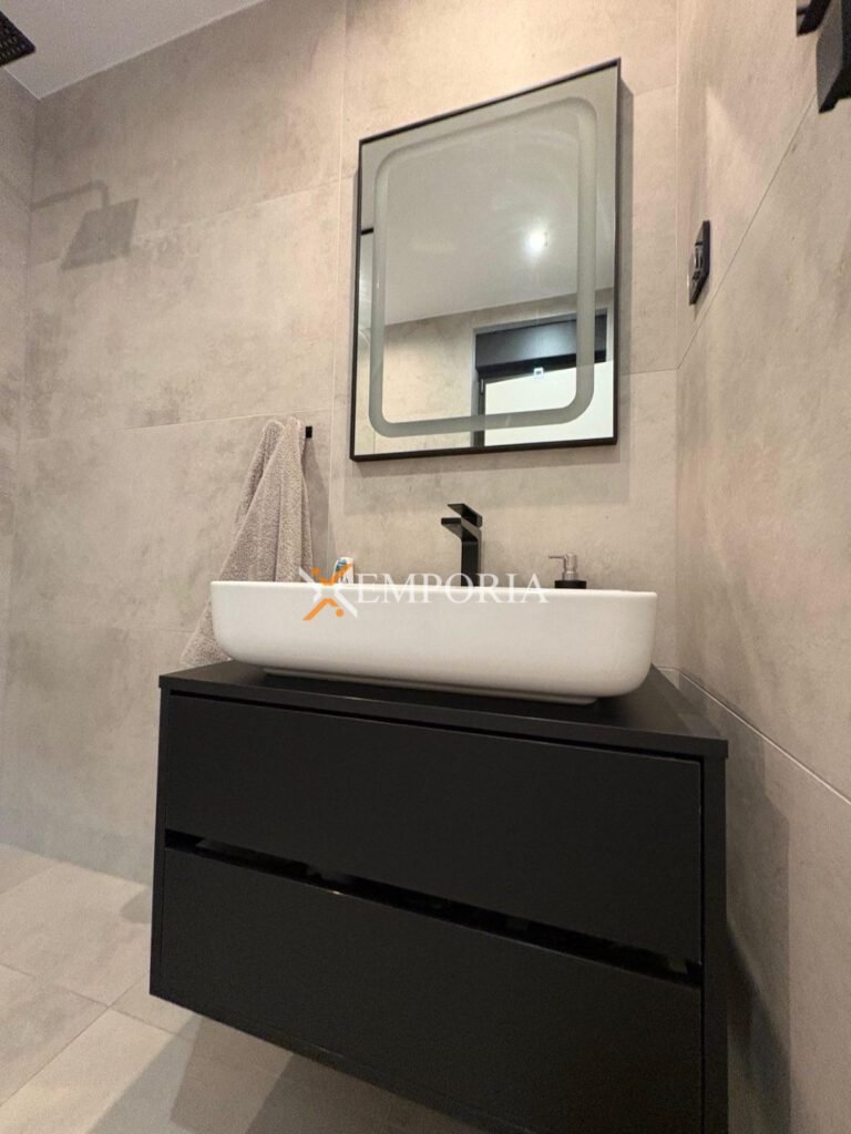 The house is built to a high standard and equipped with modern solutions. Electric underfloor heating is installed in the living room and bathrooms, while four air conditioning units are distributed across all bedrooms and the living room. The walls are built from brick thermal blocks, the facade has 10 cm of insulation, and PVC joinery with triple glazing includes electric shutters. Floors are finished with a combination of tiles and laminate. Security doors and a chimney are installed, while the flat concrete roof ensures durability. The property also includes three parking spaces.