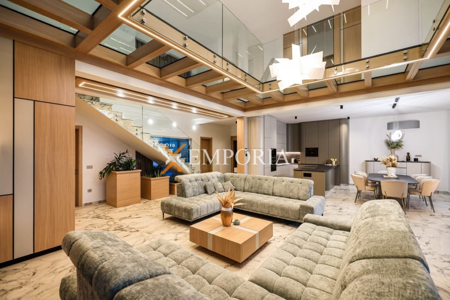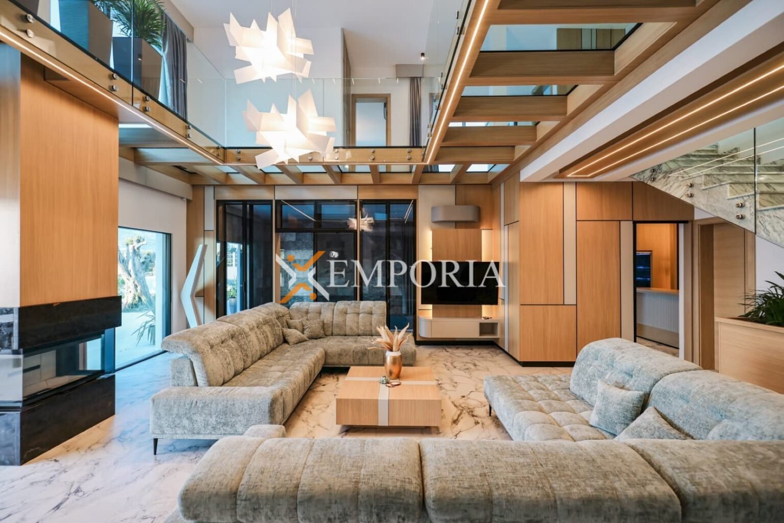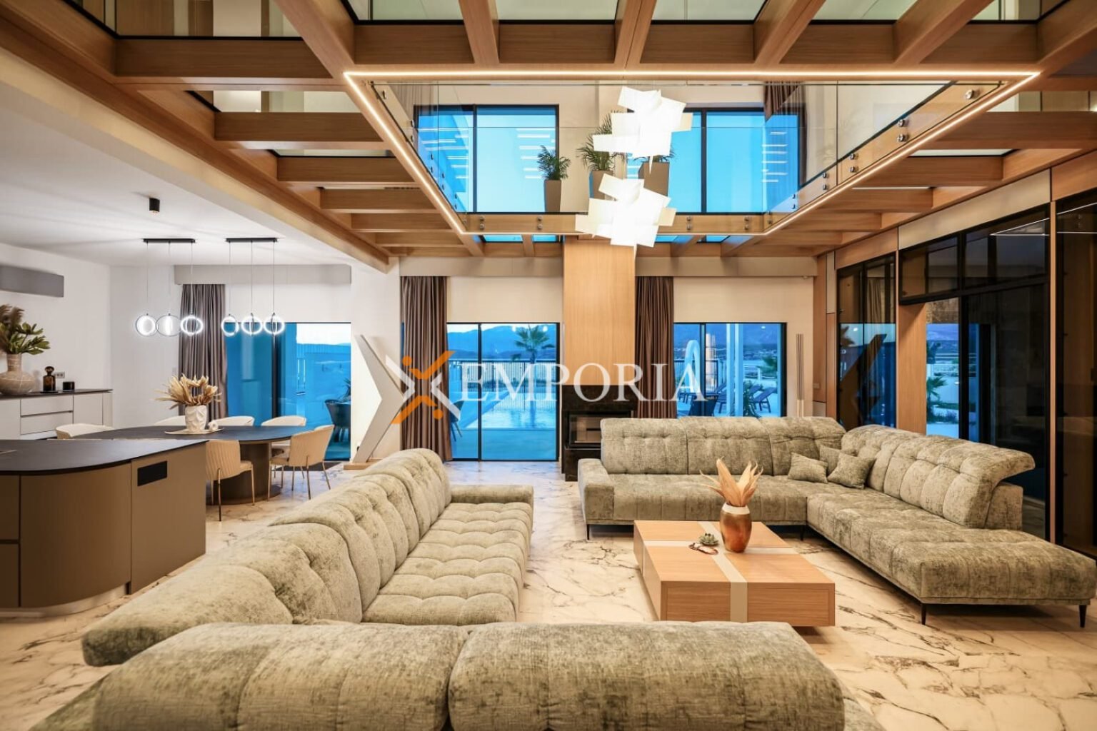 The total net area of the villa is 482,08 m², while the total area including the pools reaches 554,08 m². It sits on a beautifully landscaped plot of 1.100 m², surrounded by pine trees, palms, and olive trees.
