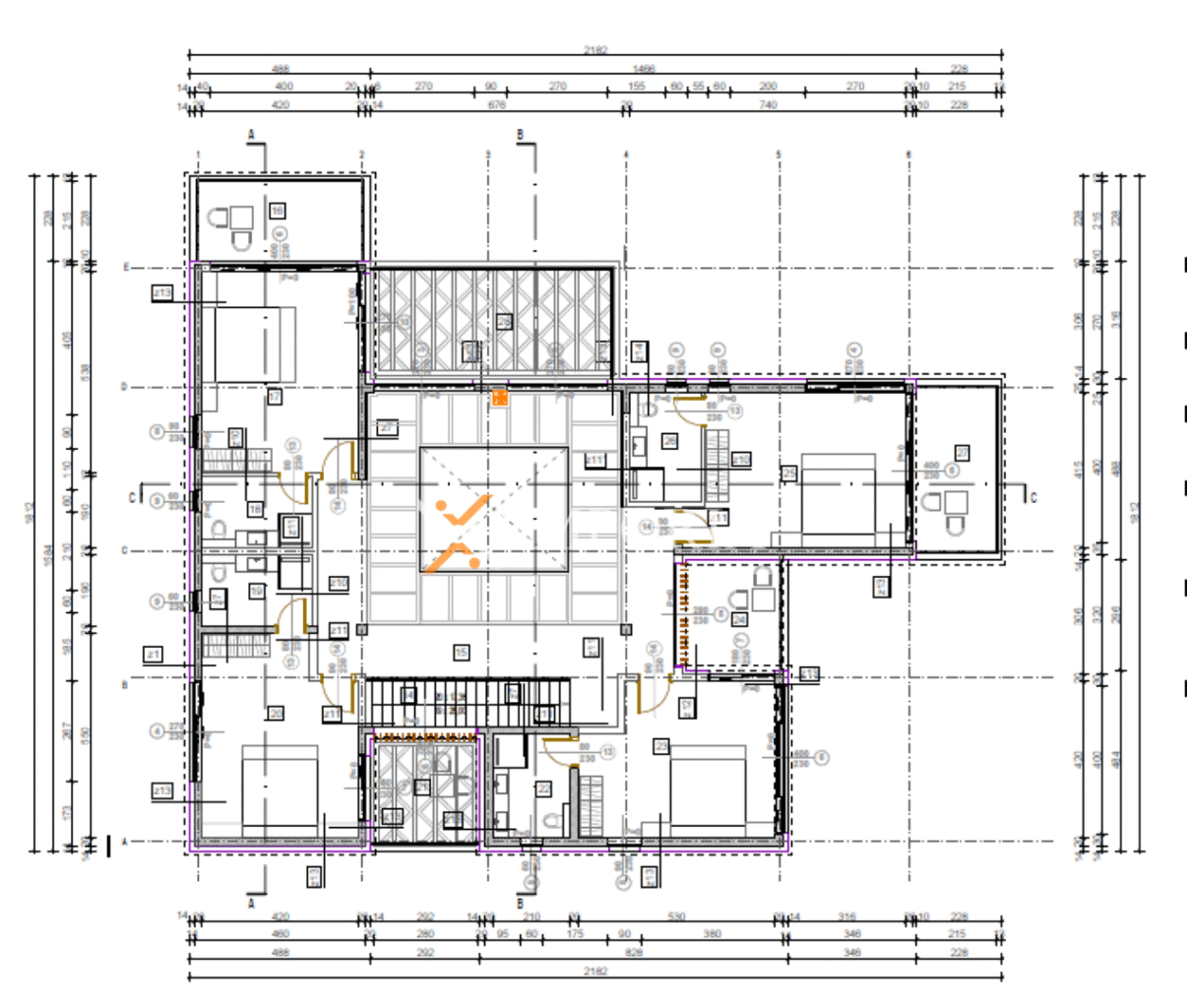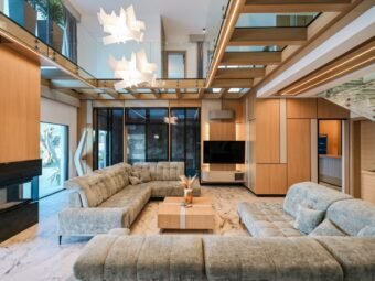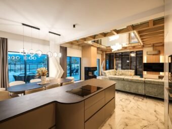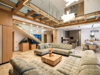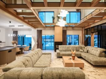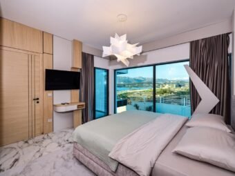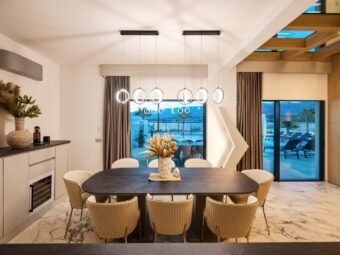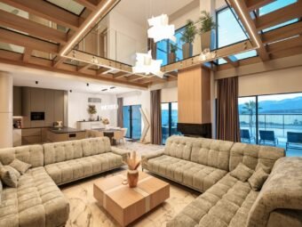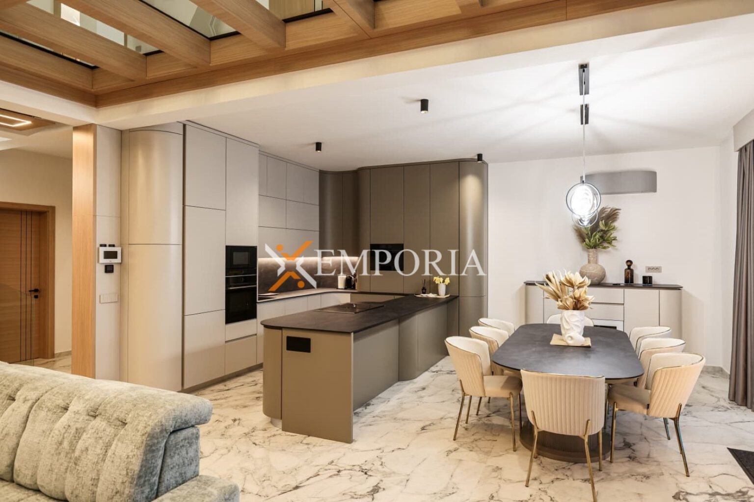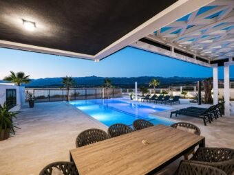 The total net area of the villa is 482,08 m², while the total area including the pools reaches 554,08 m². It sits on a beautifully landscaped plot of 1.100 m², surrounded by pine trees, palms, and olive trees.