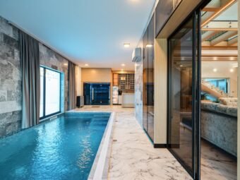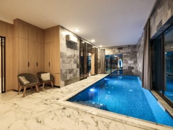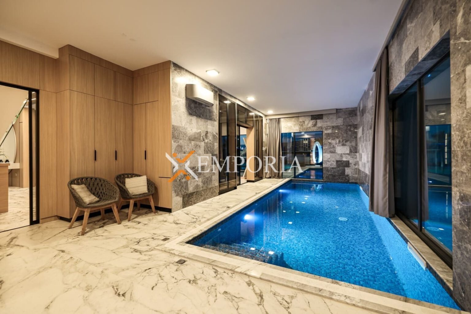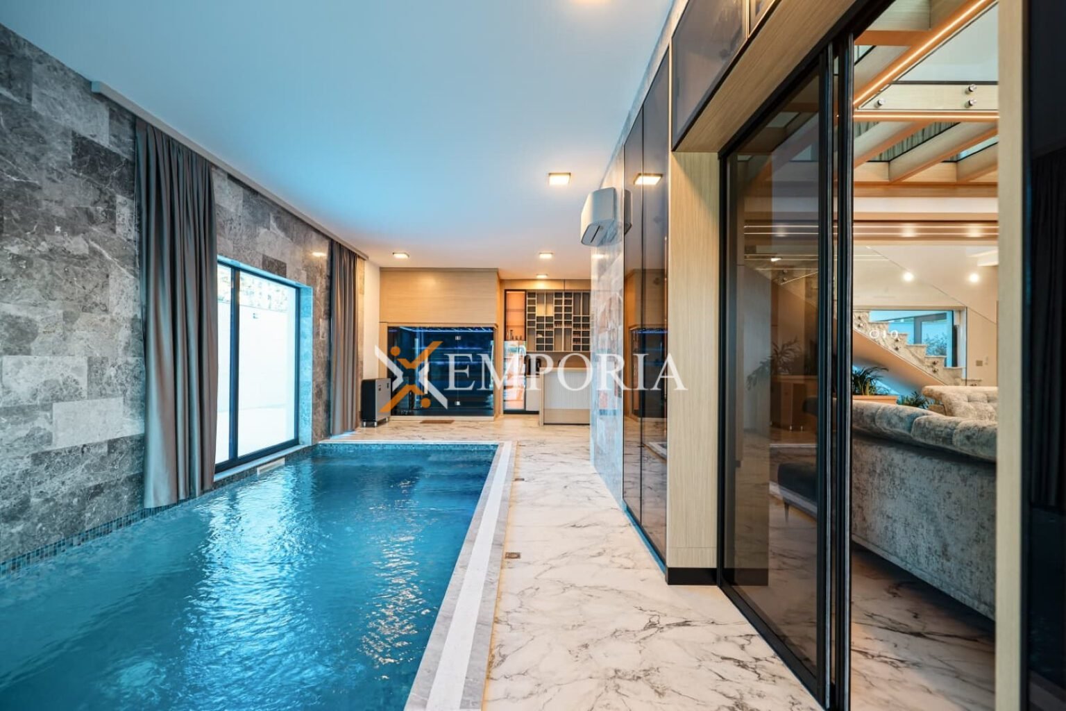 The indoor pool (30,47 m²) is lined with ceramics, includes heating and counter-current swimming, while the outdoor pool (90 m²) also offers heating and ceramic finishing.