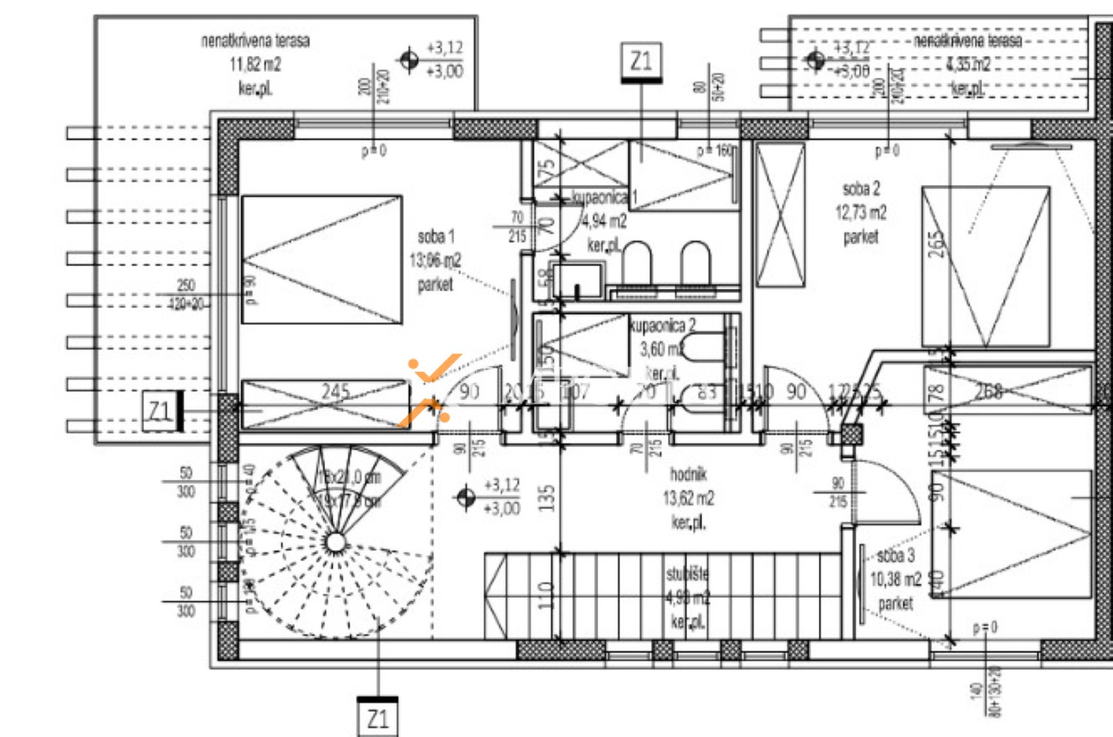 The first floor comprises two bedrooms, one bathroom, and one bedroom with a private bathroom, as well as two uncovered terraces.