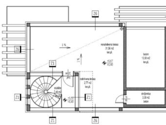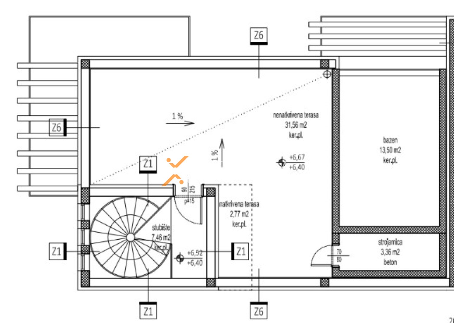 The roof terrace features a combination of covered and uncovered areas, along with a swimming pool and technical room.