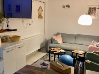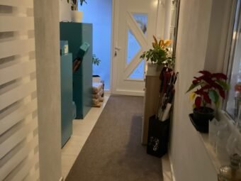 The house consists of one residential unit and is designed as a single-storey ground floor property. The total living area amounts to 87,01 m². The layout includes an entrance porch, a living room connected to the kitchen and dining area, three bedrooms, and two bathrooms. A storage room of 1,53 m² is located under the staircase, while a covered terrace is positioned in front of the house, providing a pleasant outdoor space.