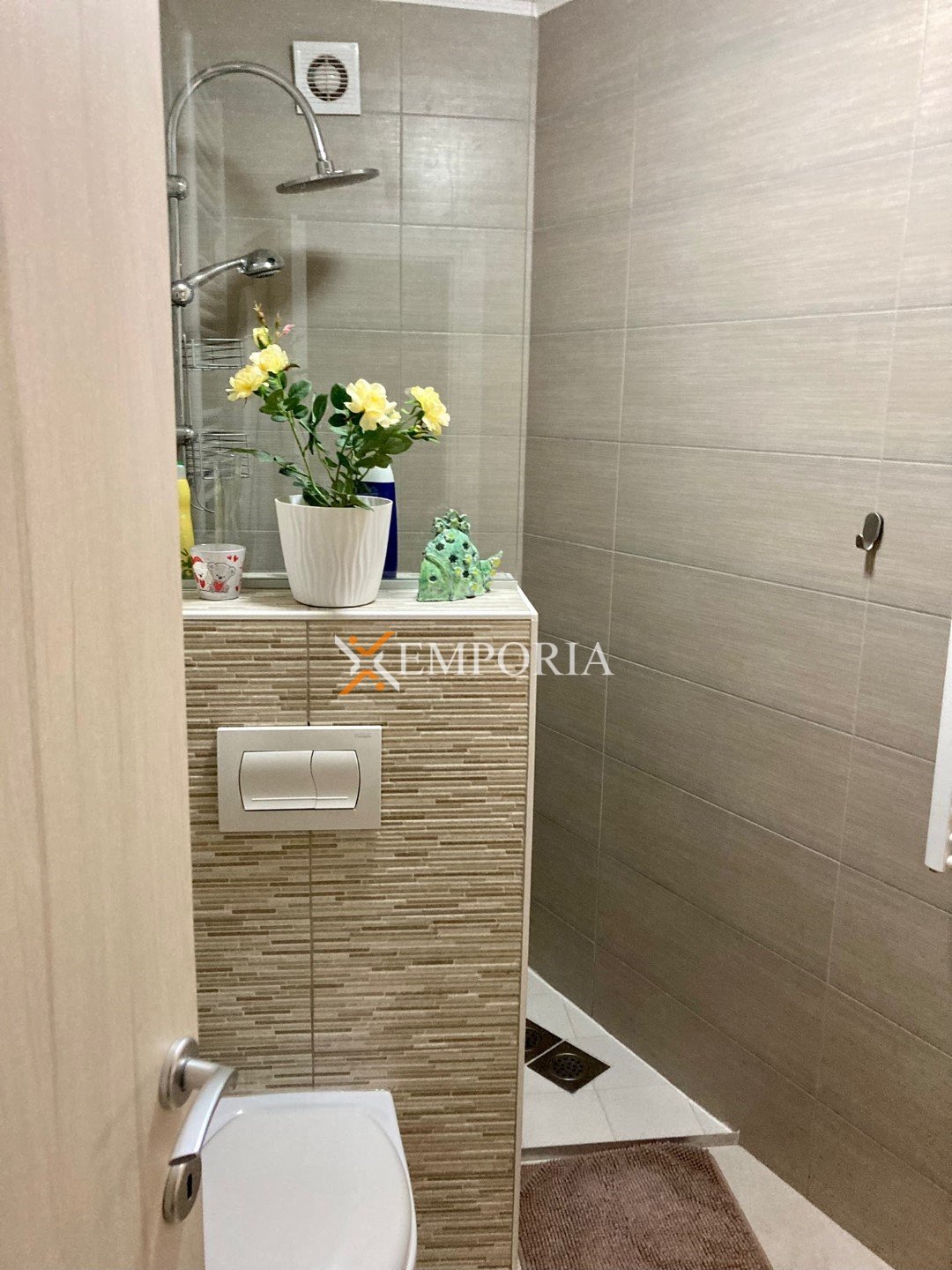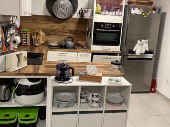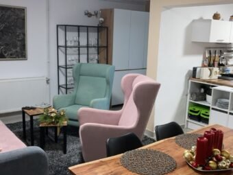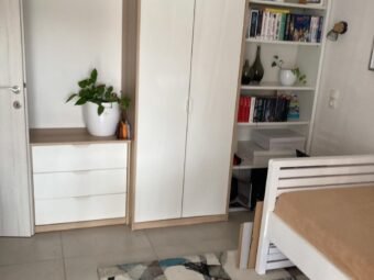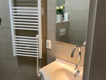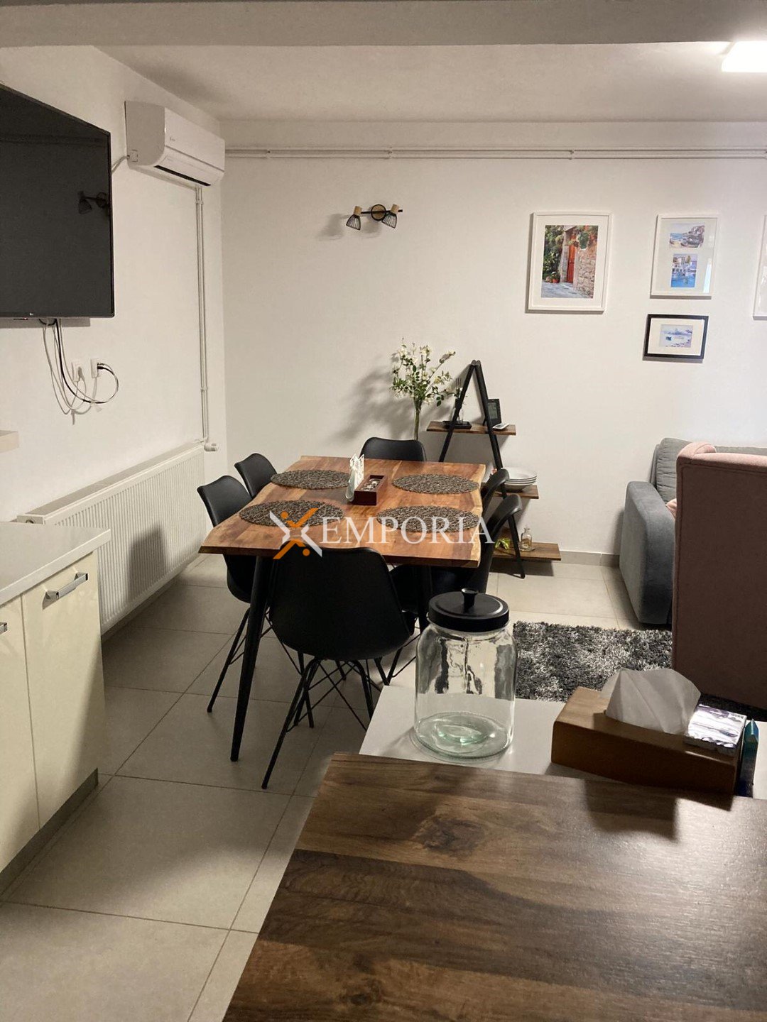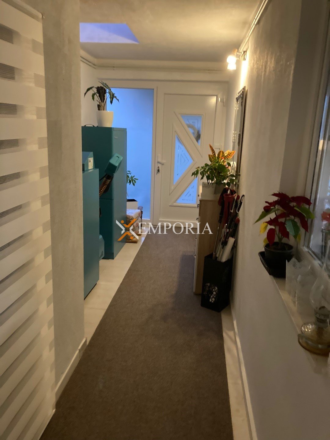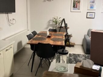 The house is sold fully furnished. Central heating is provided via a pellet system, while air conditioning is installed through four units located in the living room and bedrooms. The house is built using brick blocks and features PVC windows with shutters and mosquito screens. The façade is insulated with 10 cm Styrofoam. Floor coverings consist of tiles, and a chimney is also available.