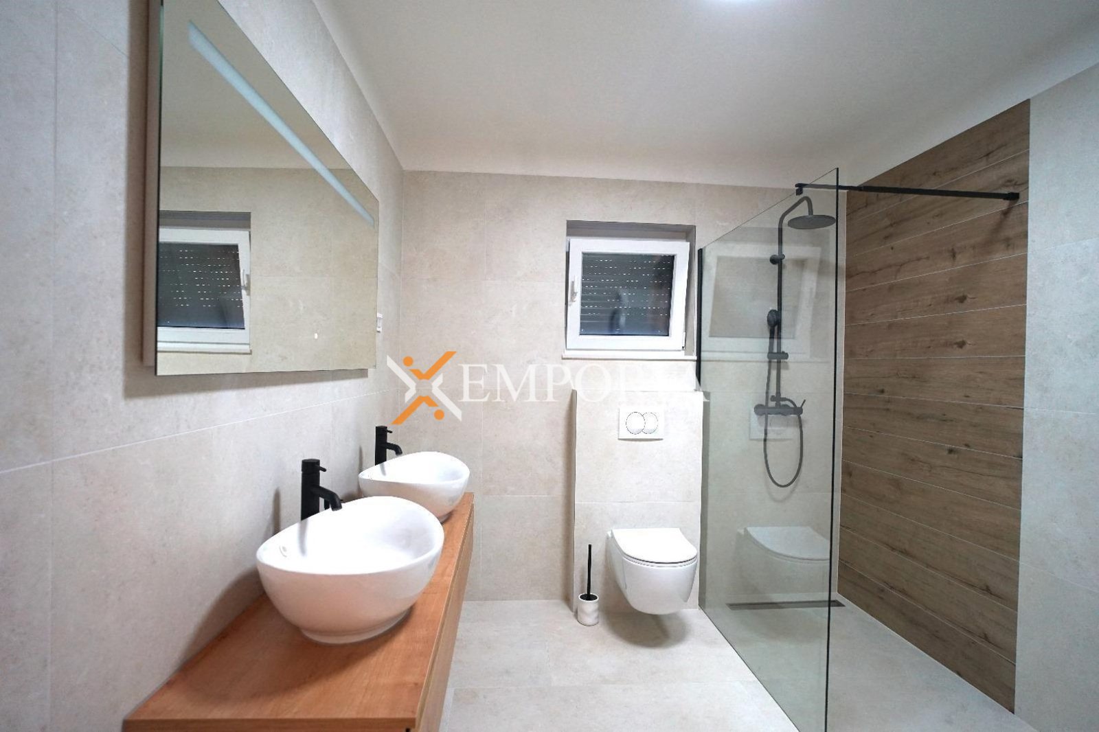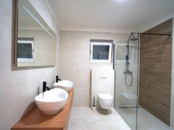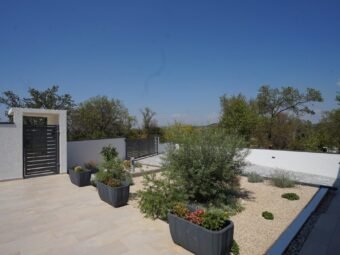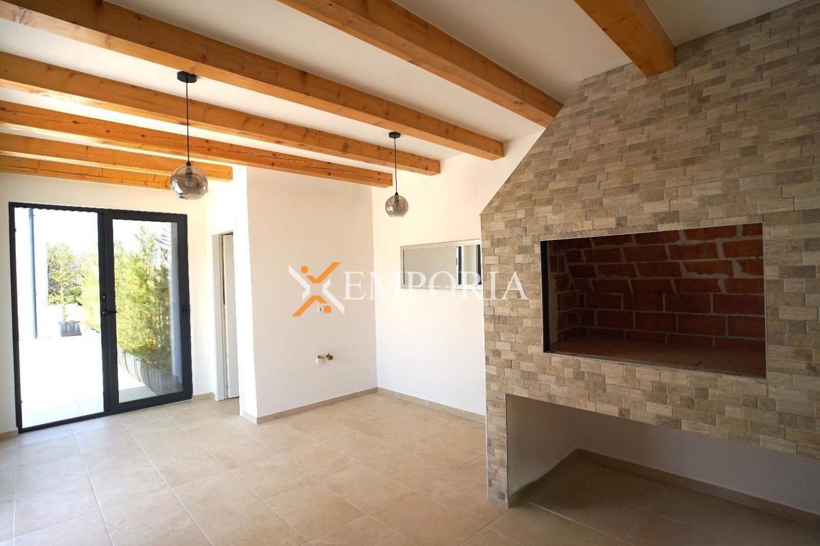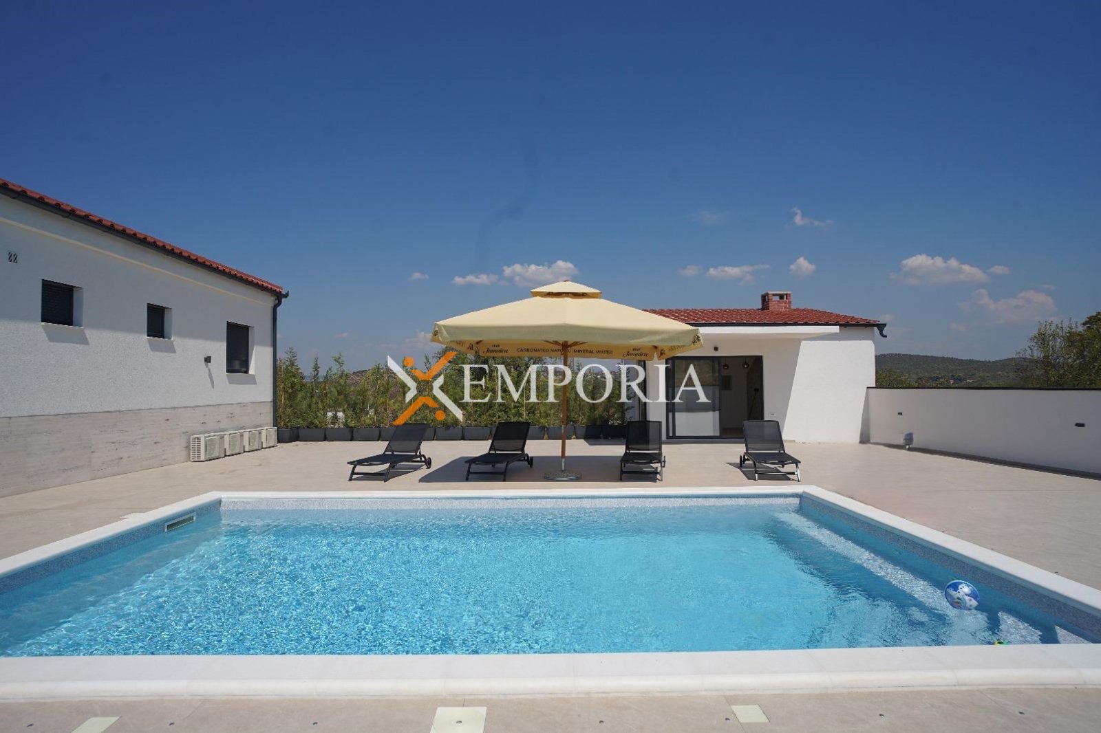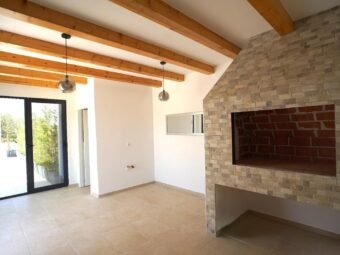 The house is sold furnished. It has 4 air conditioning units. It is built with thermal brick blocks, while the façade has 10 cm Styrofoam insulation. Windows are PVC with shutters, mosquito nets, and triple glazing. Floors are covered with tiles. The house has a chimney.